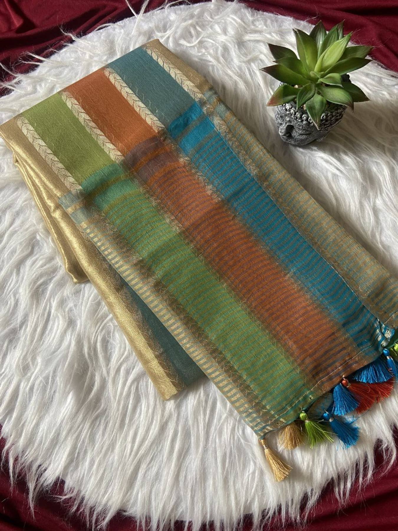 Experience elegance redefined with our Soft Tissue Silk Sarees, crafted with beautiful weaving and an attractive traditional design. This saree features a matching woven blouse and graceful tassel edging, offering a luxurious drape and rich texture that’s perfect for festive, party, or wedding wear.
