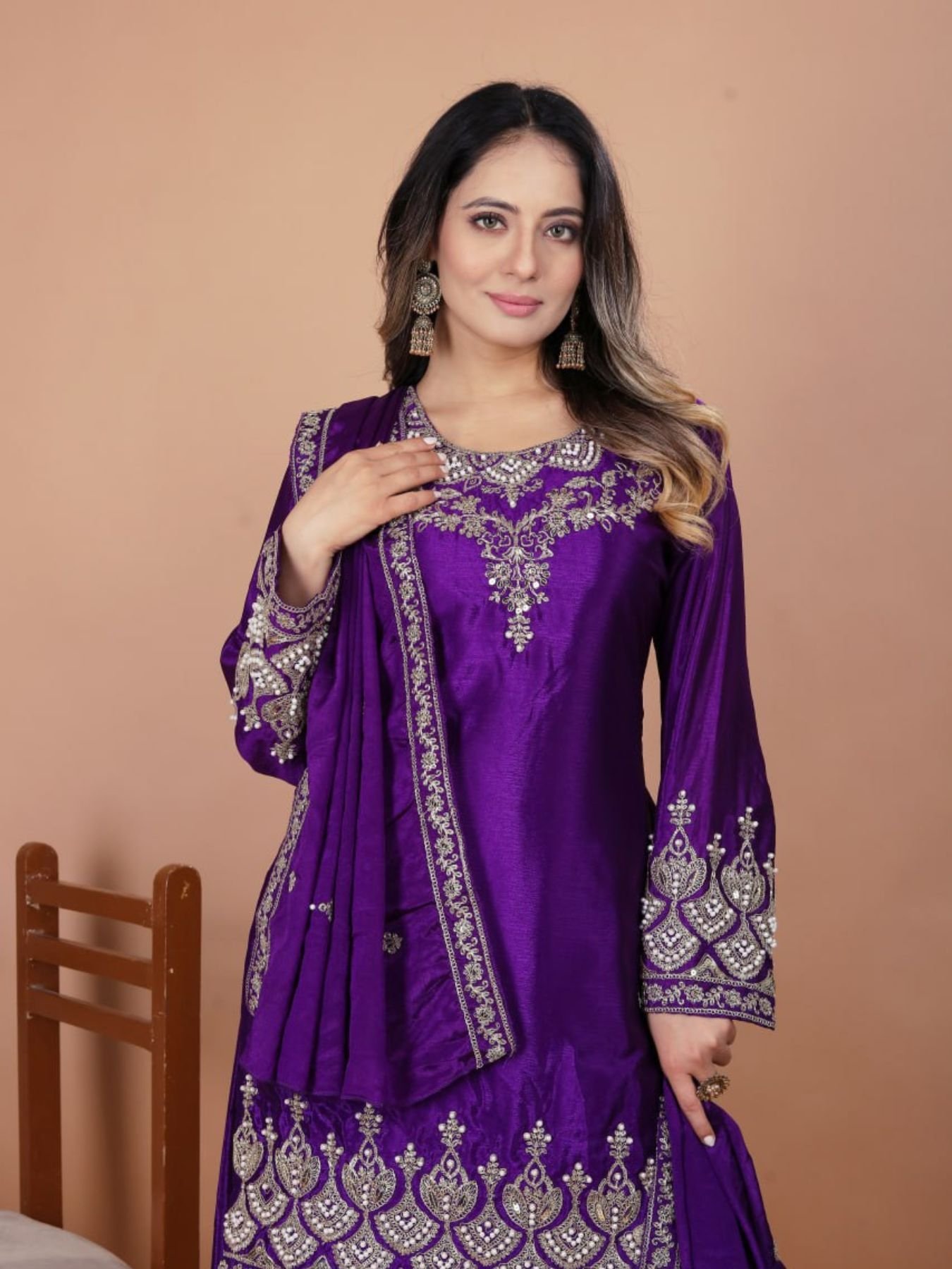 Alluring Purple Chinon Sharara Suit with Coding Sequins and Moti Work