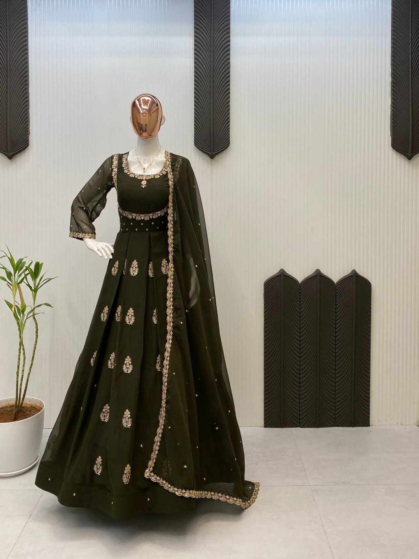 Elegant georgette long gown designed with premium sequence embroidery for a rich festive appeal.