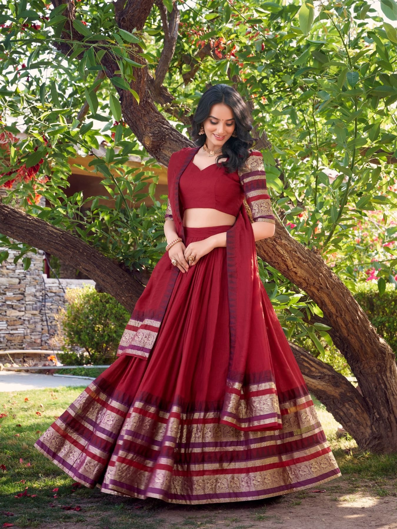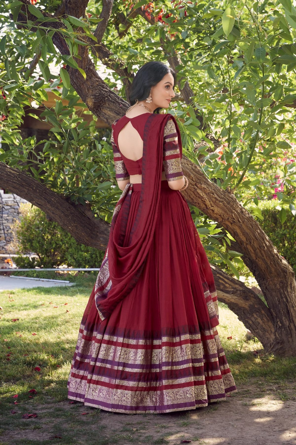 Experience timeless elegance with this Royal Lehenga Choli Set crafted from pure Chanderi fabric, enriched with exquisite zari weaving work. The lehenga is fully stitched with a comfortable drawstring and zip closure, featuring a flattering 4-meter flair and lined with soft micro cotton for added comfort. The unstitched blouse and matching dupatta complete this regal ensemble, perfect for weddings, festivals, and special occasions.