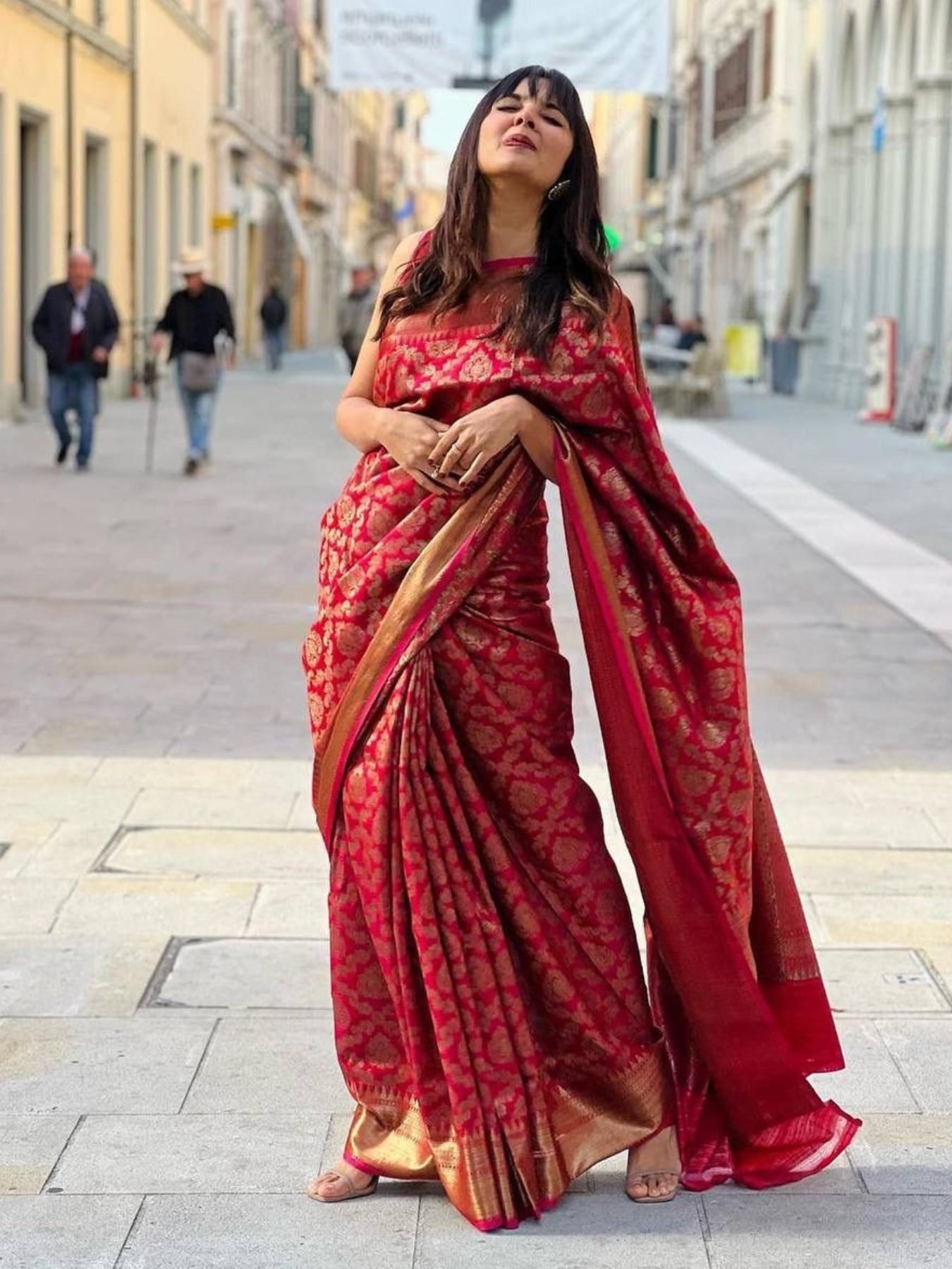* STUNNING RED COLOUR SAREE WITH HEAVY BROCADE BLOUSE *