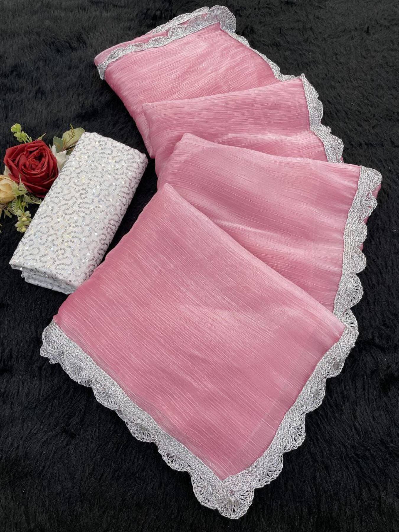 Bollywood Trending Jimee Chu Saree with Premium Silver Lace & Sequin Embroidery Blouse