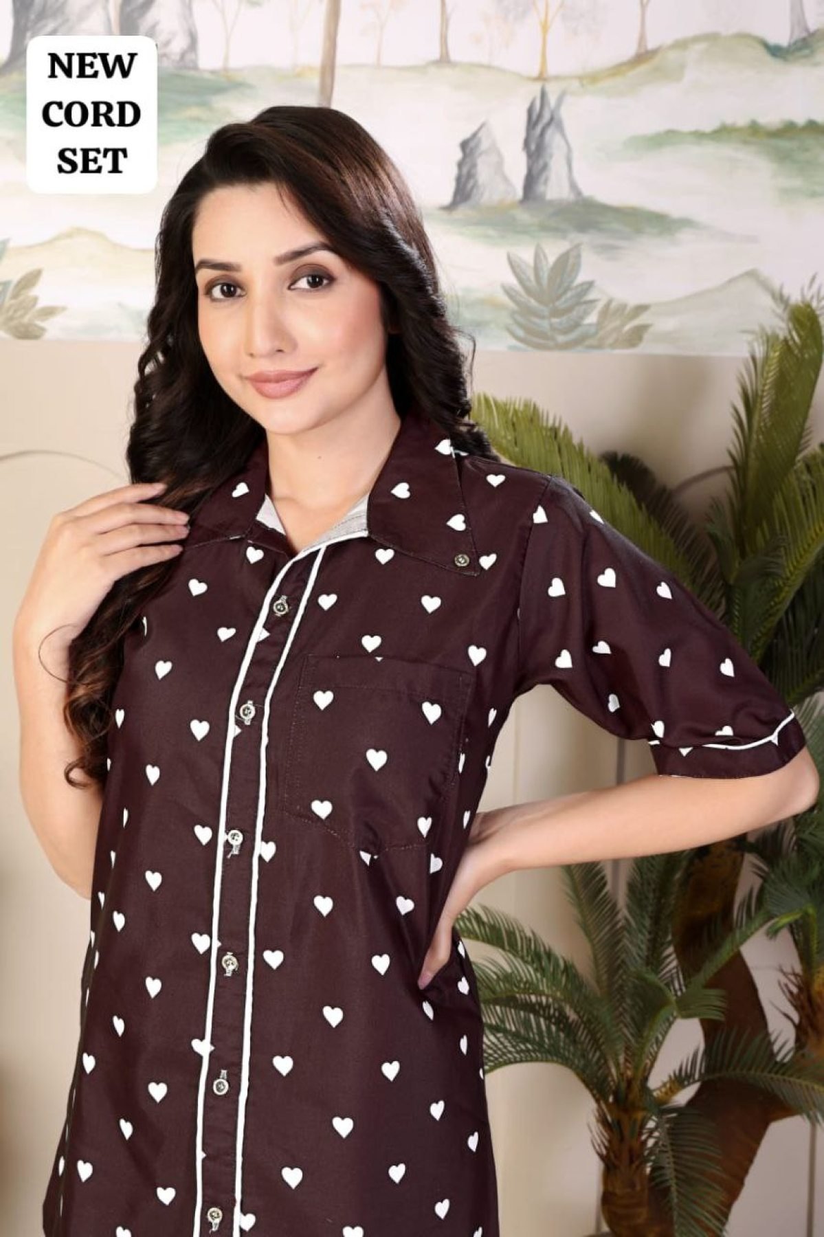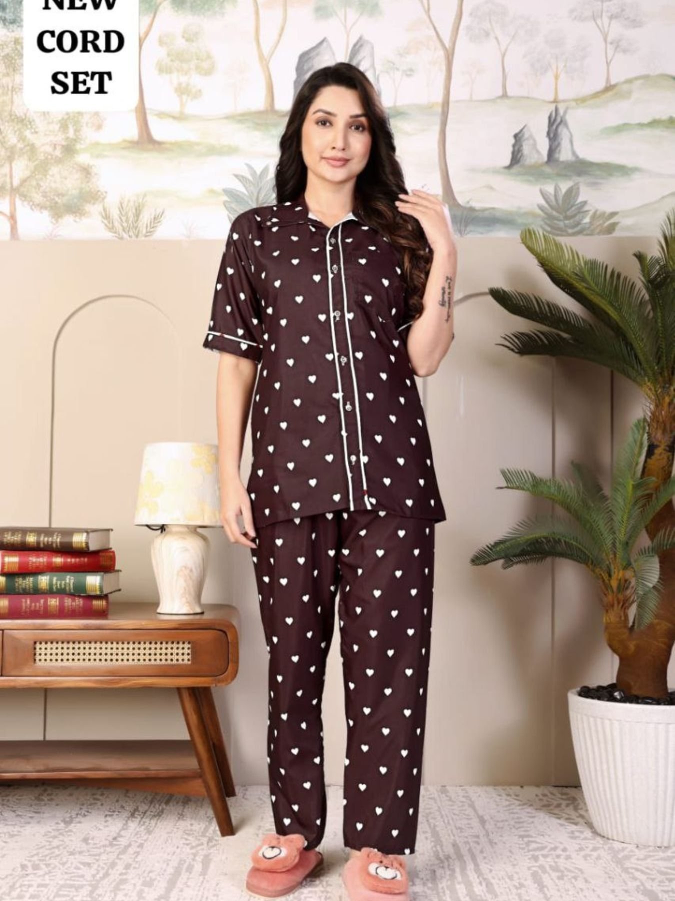 Brown Rayon Printed Nightwear Cord Set Trendy Top and Pant for Casual Wear