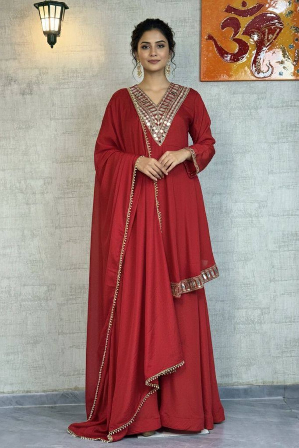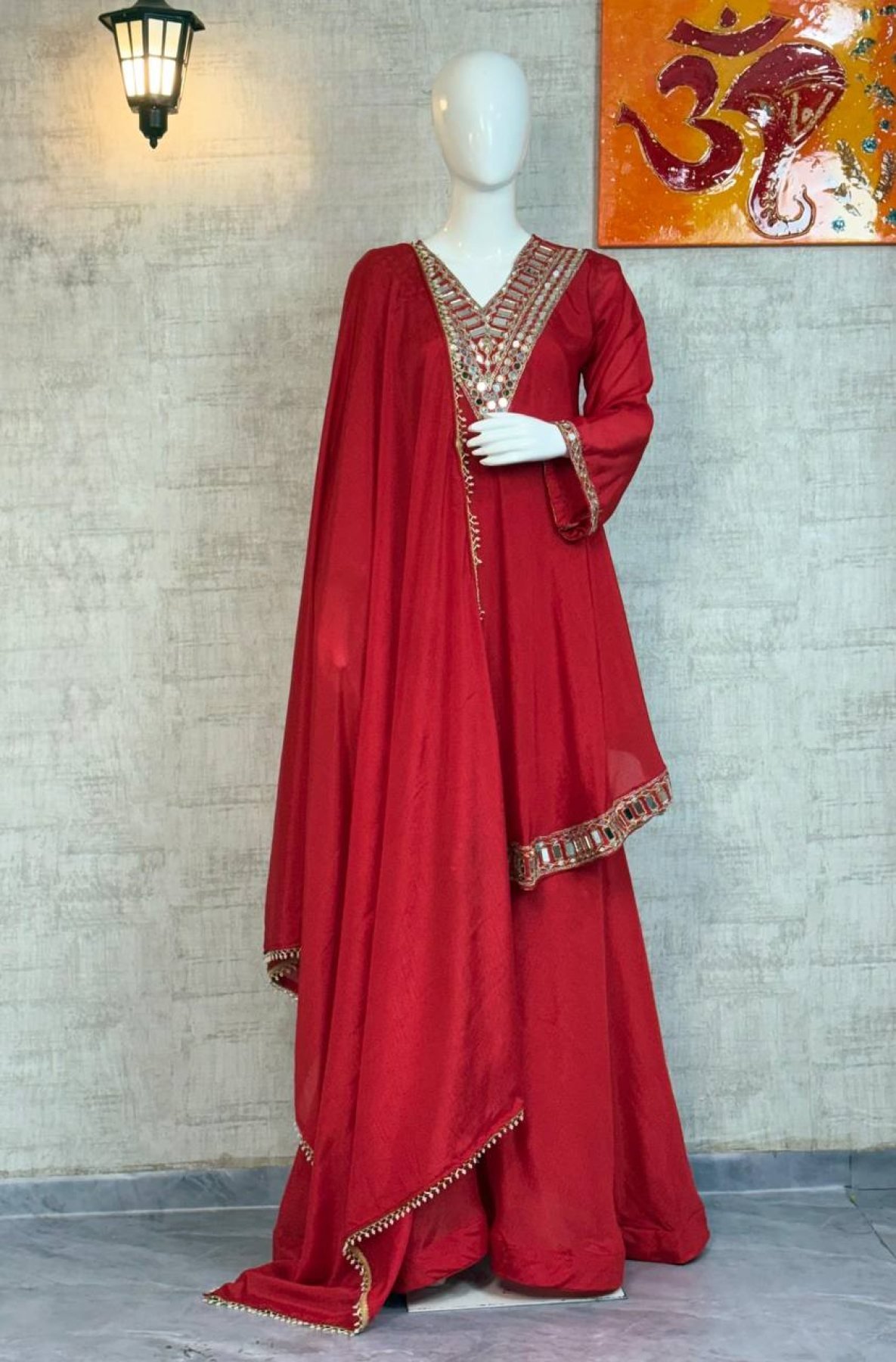 Captivating Red Fully Stithed Silk Sharara Suit for Night Party Wear