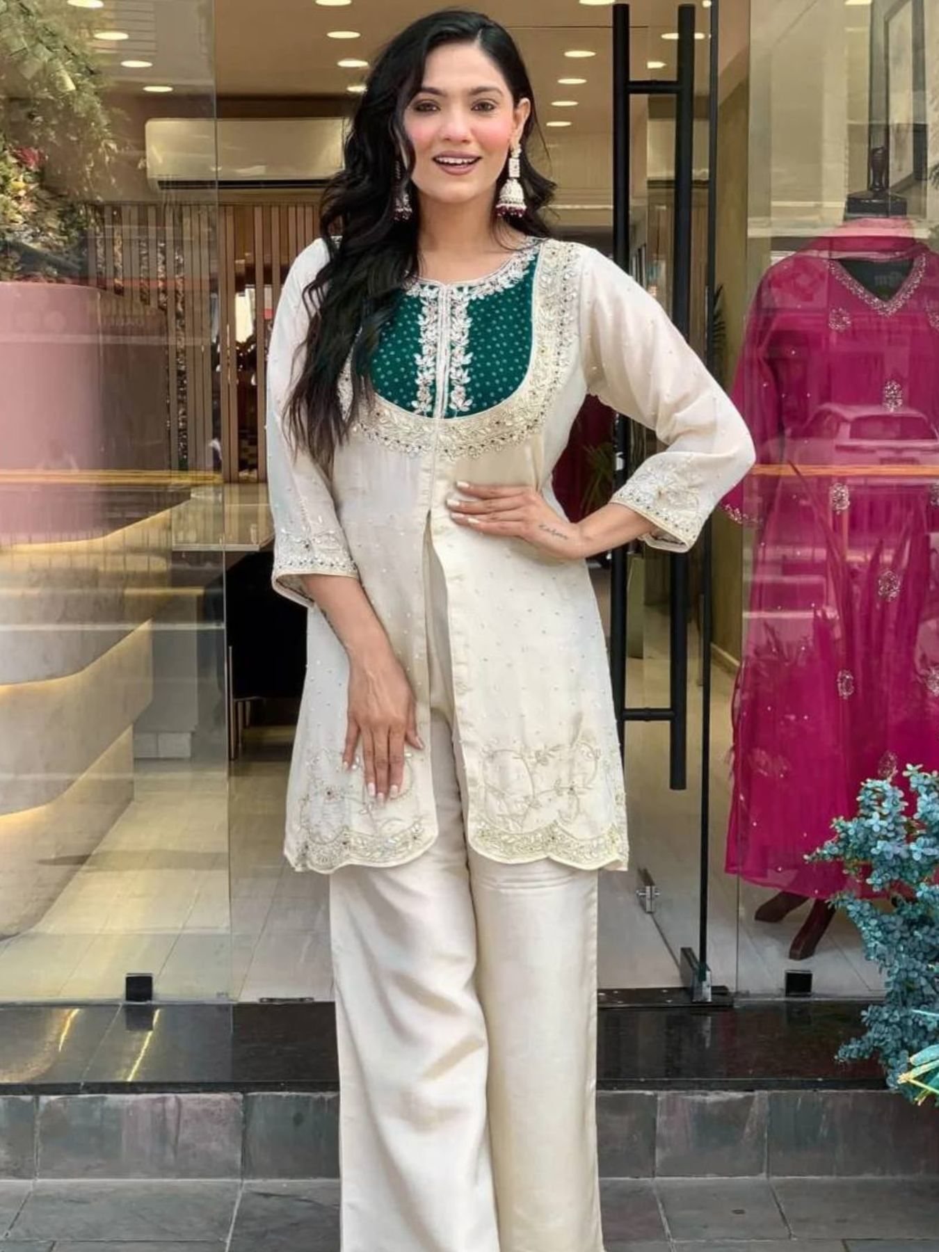 Cream and Green Kurta Palazzo Set for Women Festive Outfit with Diwali Discount Offer
