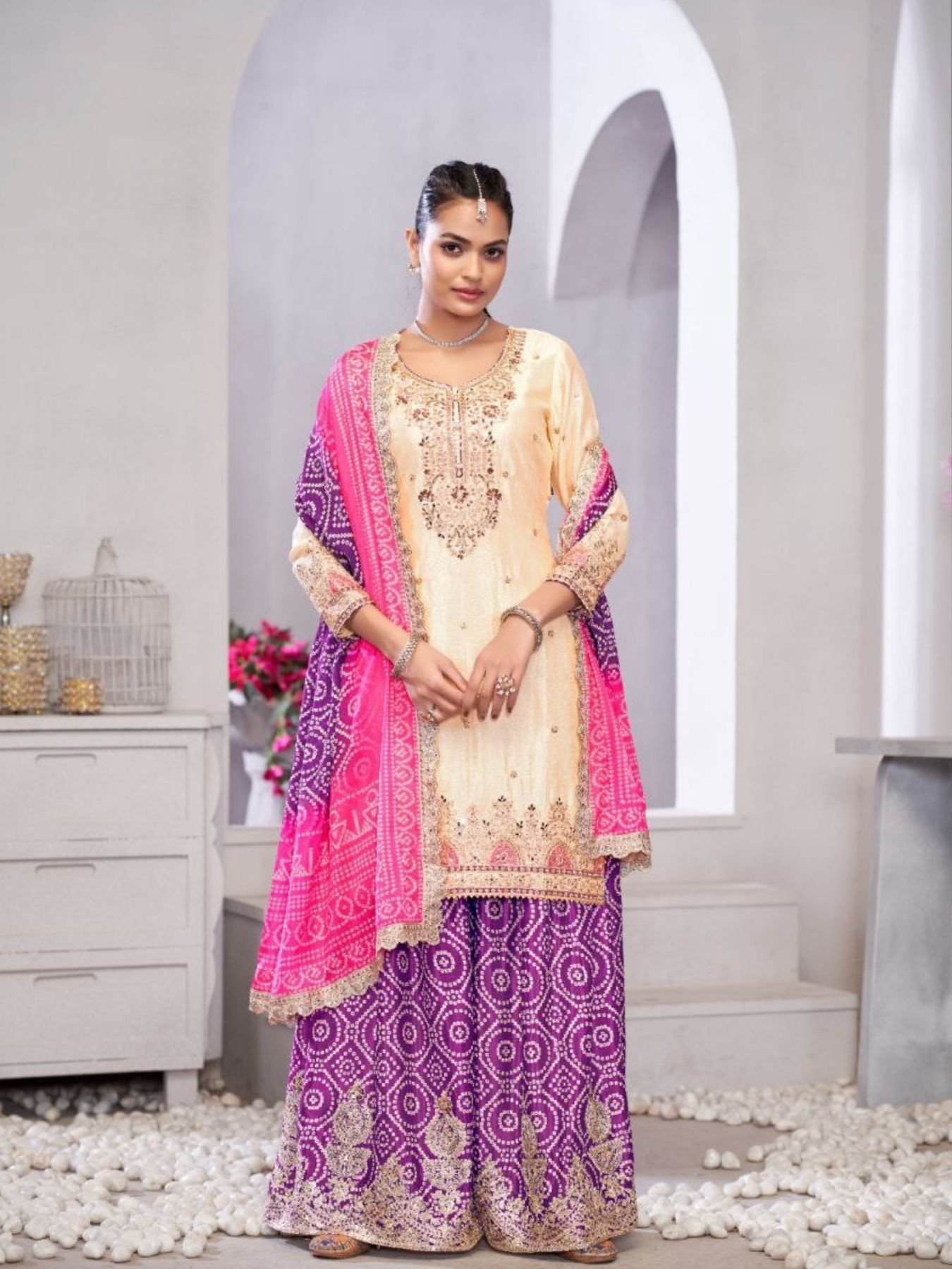 Cream Chinnon Sharara Suit with Mirror and Zari Work Bridal and Sangeet Wear