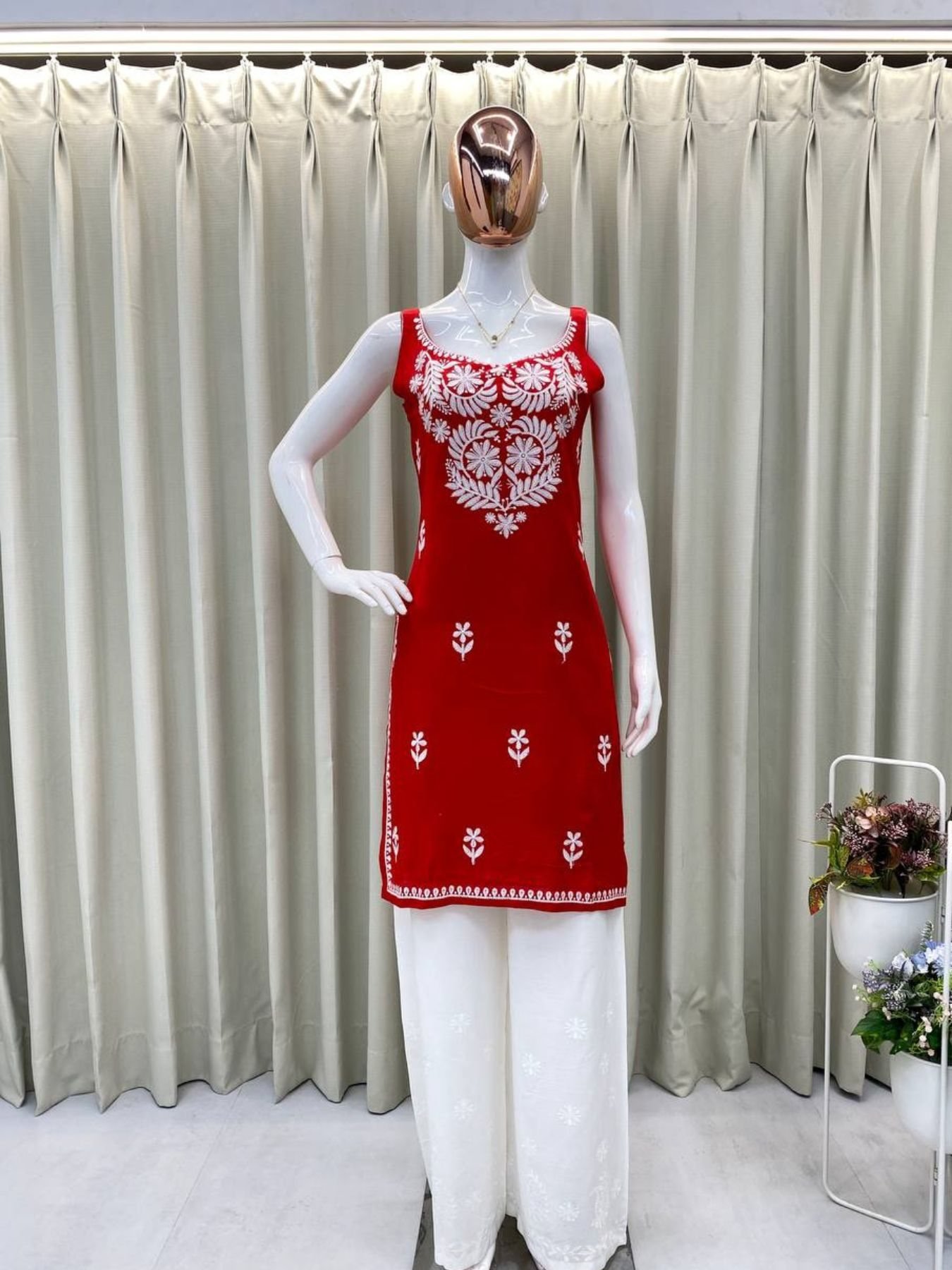 Deep Red Embroidered Kurti with White Palazzo Classic Festive Pairing with Bold Flair
