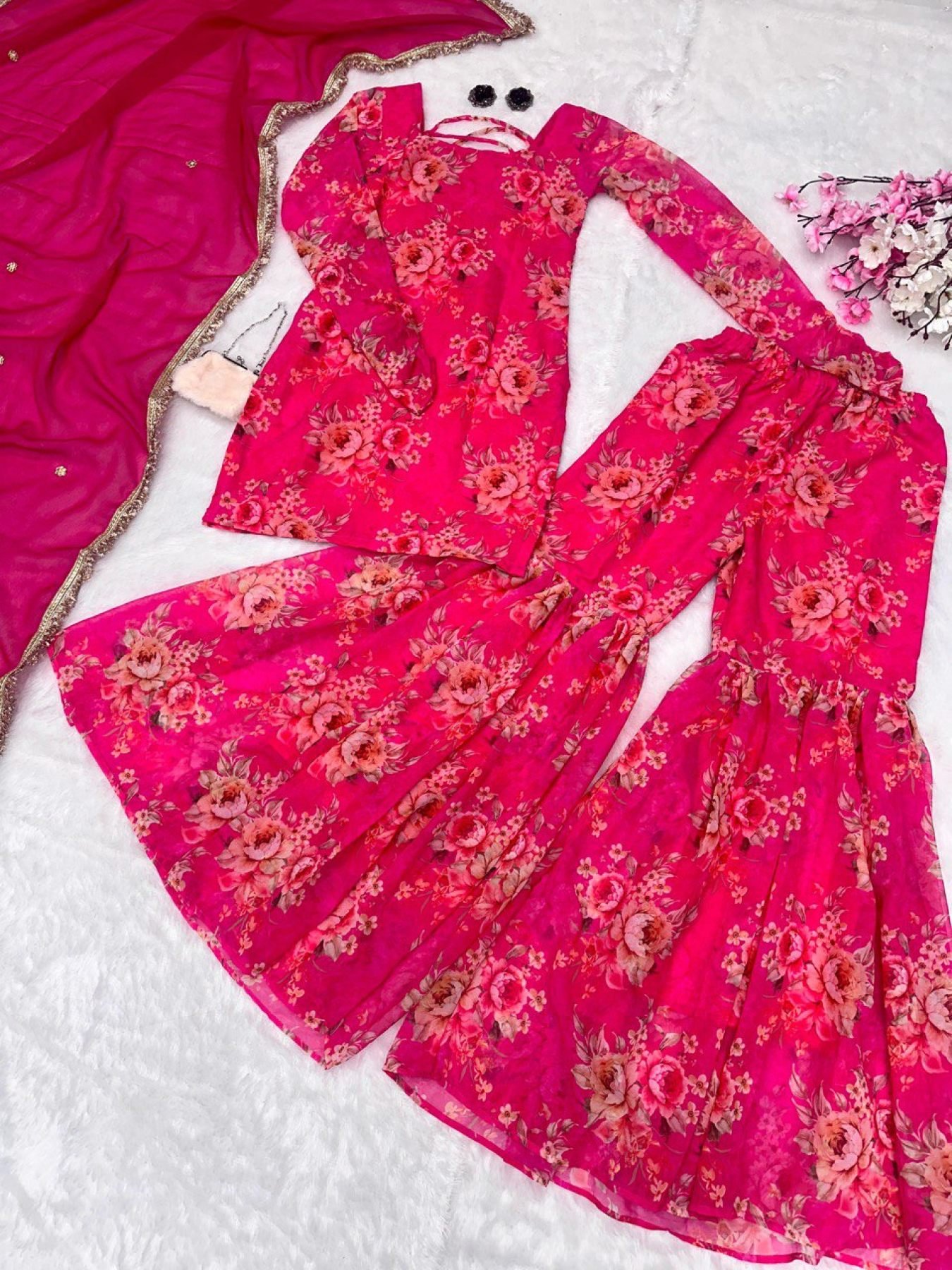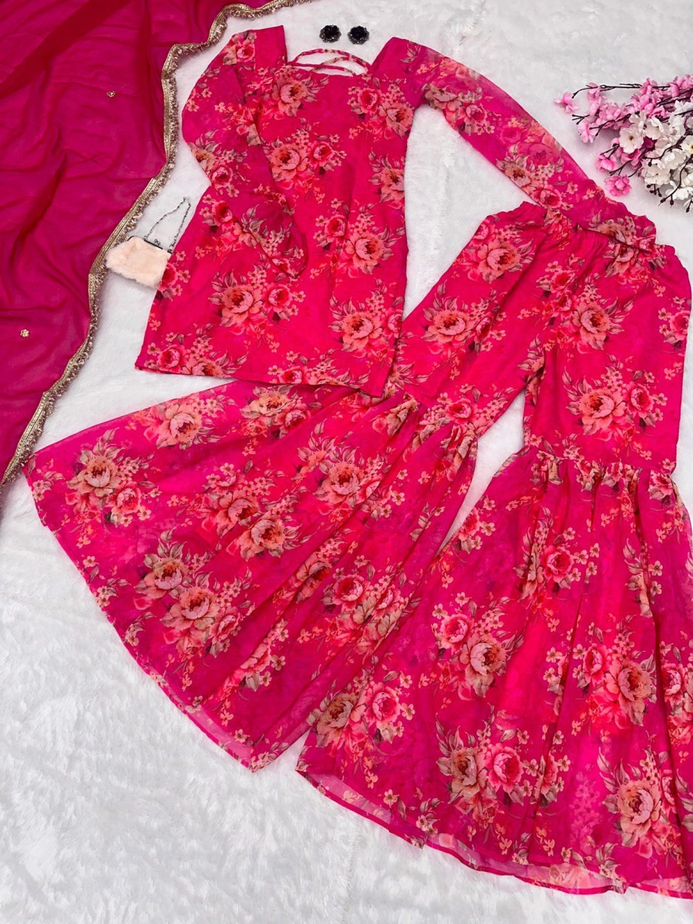 Digital Pink Floral Printed Georgette Sharara Set Designer Wedding Wear