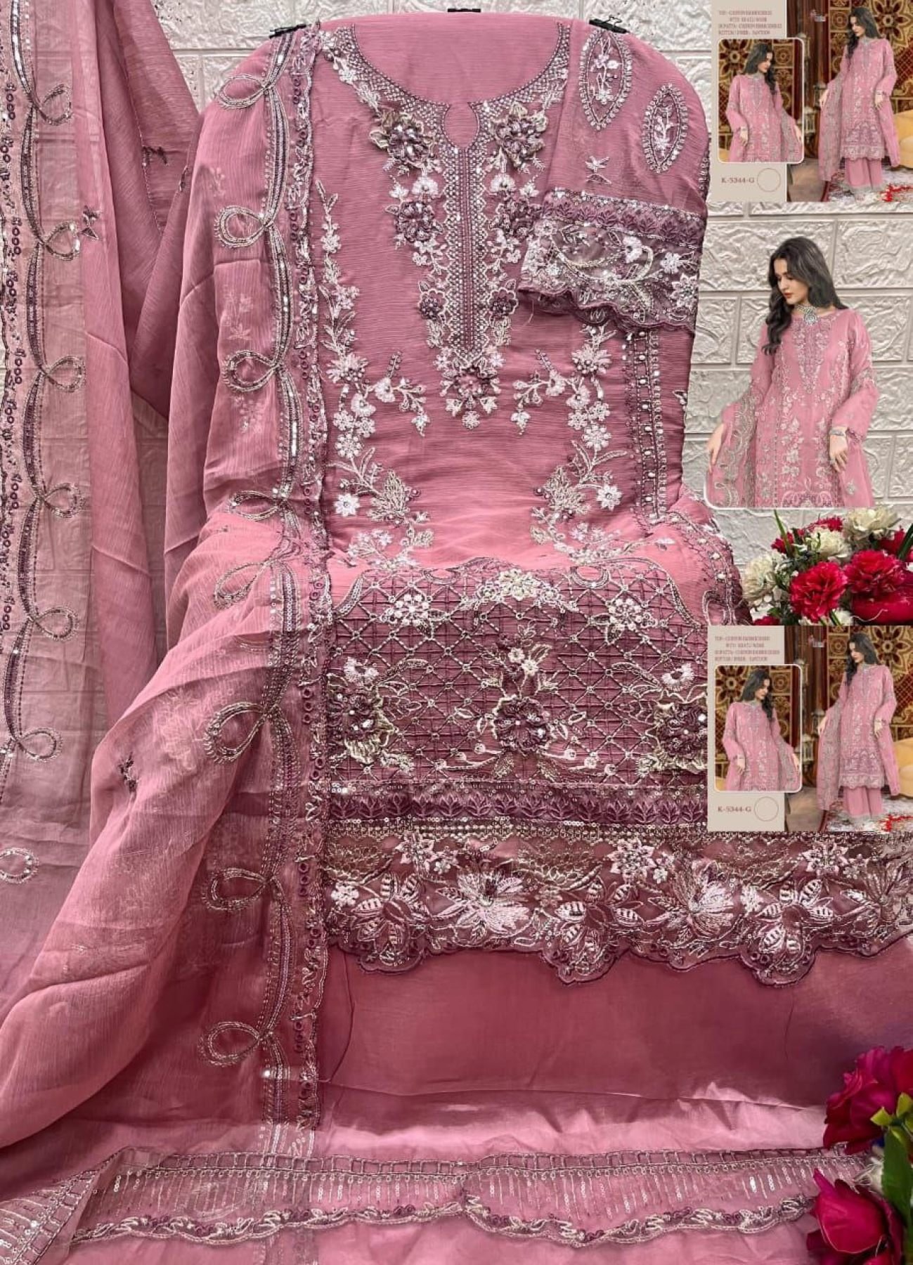 Shree Designer D.No. K 5344 is a luxurious partywear suit crafted in heavy dinting chiffon with intricate hand khatli embroidery. Paired with a smooth santoon dull inner and an embroidered chiffon dupatta, this set is ideal for festive occasions, boutiques, and wholesale buyers seeking premium quality at manufacturer pricing.