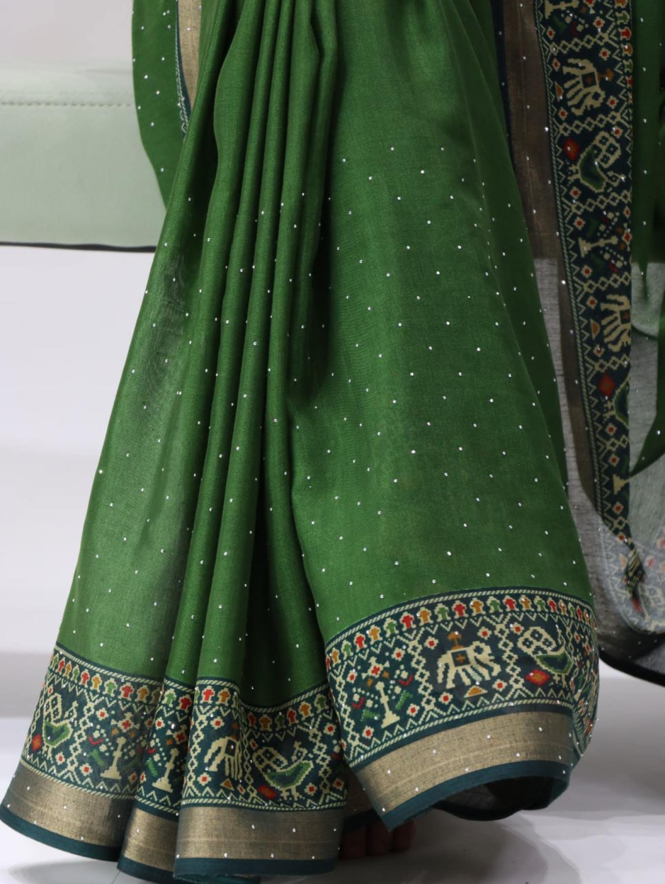 Dynamic Green Mull Cotton Patola Print Saree with Sirovski Diamond And Zari Border