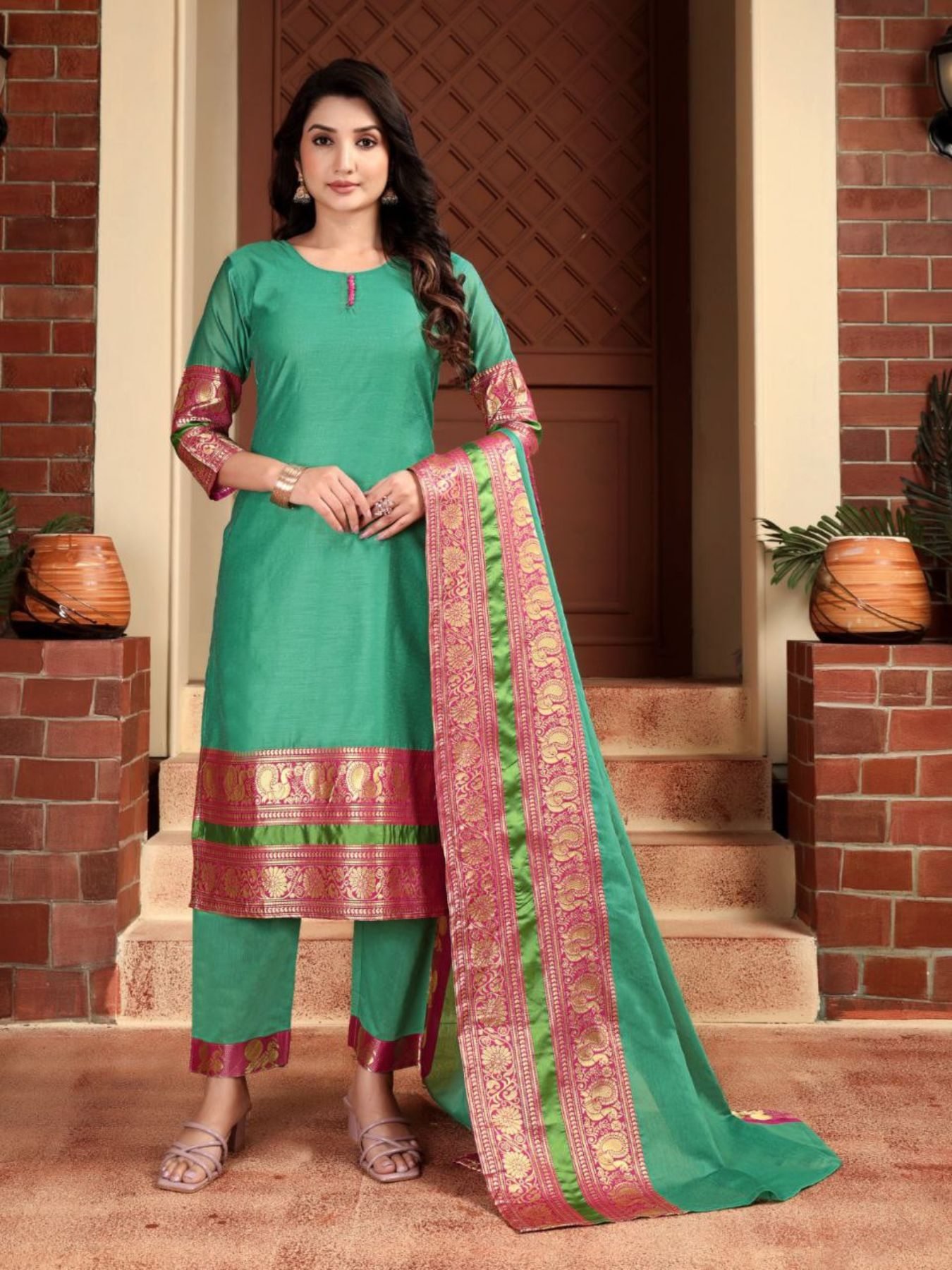 A premium Pure Kanchi Cotton Kurti Set featuring rich jacquard work, full cotton inner and three-quarter sleeves for maximum comfort.