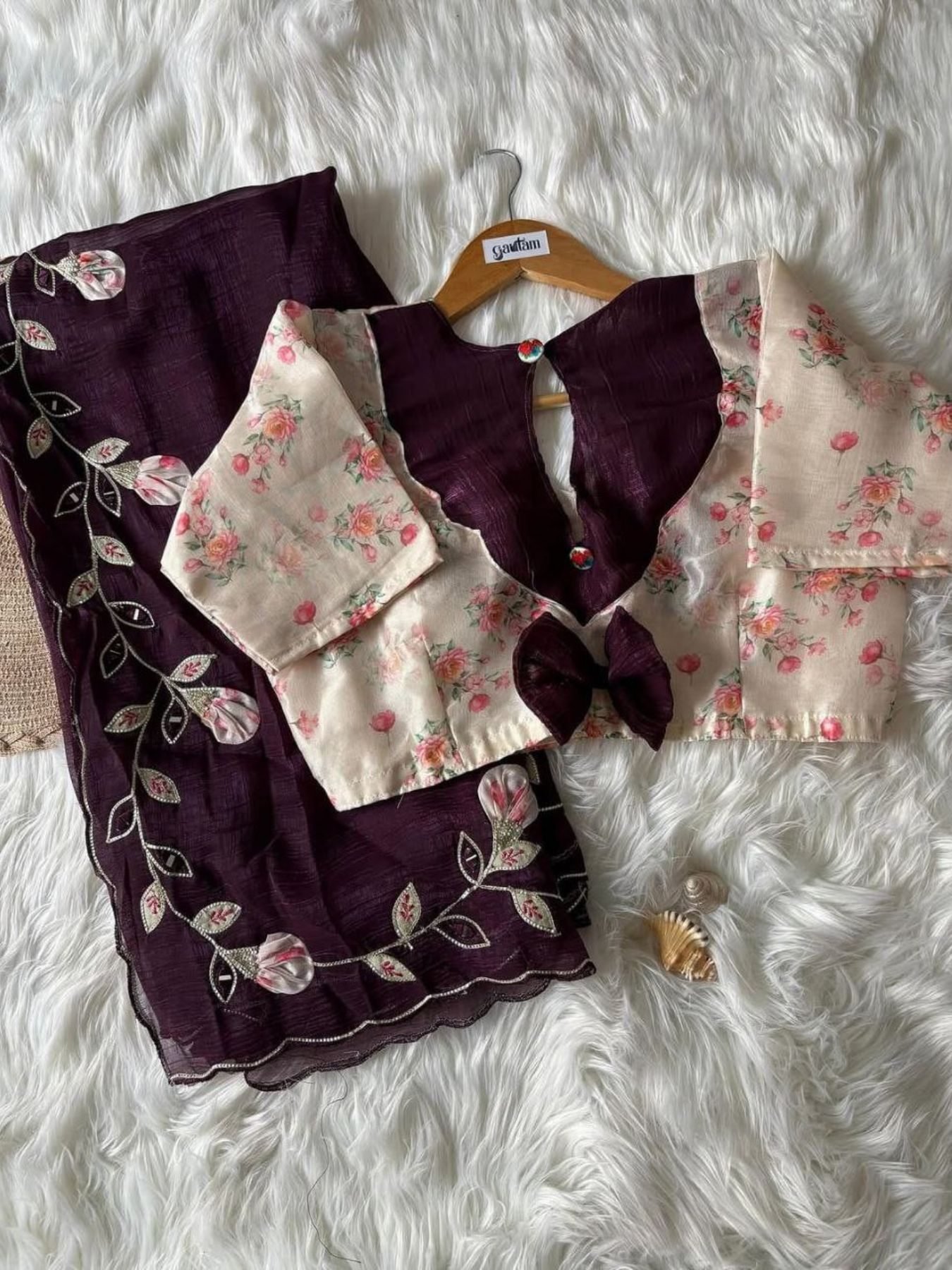 Elevate your ethnic style with this beautifully crafted Crunchy Crush saree, adorned with digital floral prints and intricate thread, khatli, moti & stone work. The elegant aarco lace border adds a refined touch, making it perfect for festive and party occasions. Comes with a matching digital print blouse, completing the premium look.