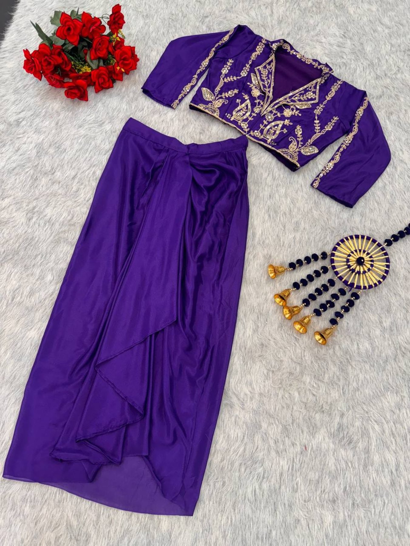 Get festive ready with our exclusive Western-style two-piece outfit featuring a stunning sequins and cording embroidery blouse paired with a stylish soft Chinon silk dhoti.Perfect blend of comfort and glamour, ideal for festive parties, sangeet nights, and modern ethnic events.Crafted from premium quality Chinon silk, this designer set ensures both luxury and elegance.