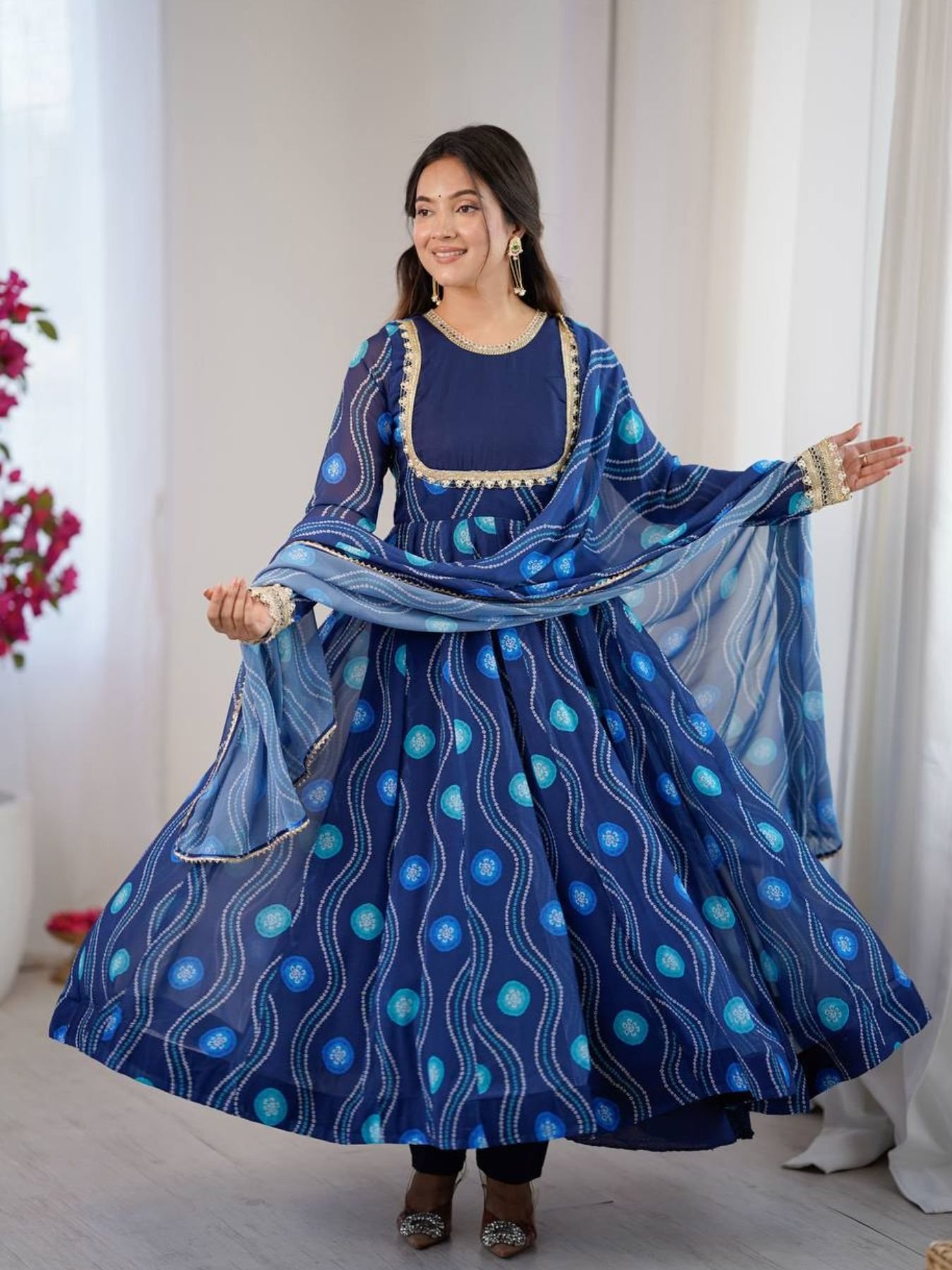 Stunning Bandhani print gown crafted in soft fox georgette with an impressive 4+ meter flair and kali cut for a grand silhouette.
