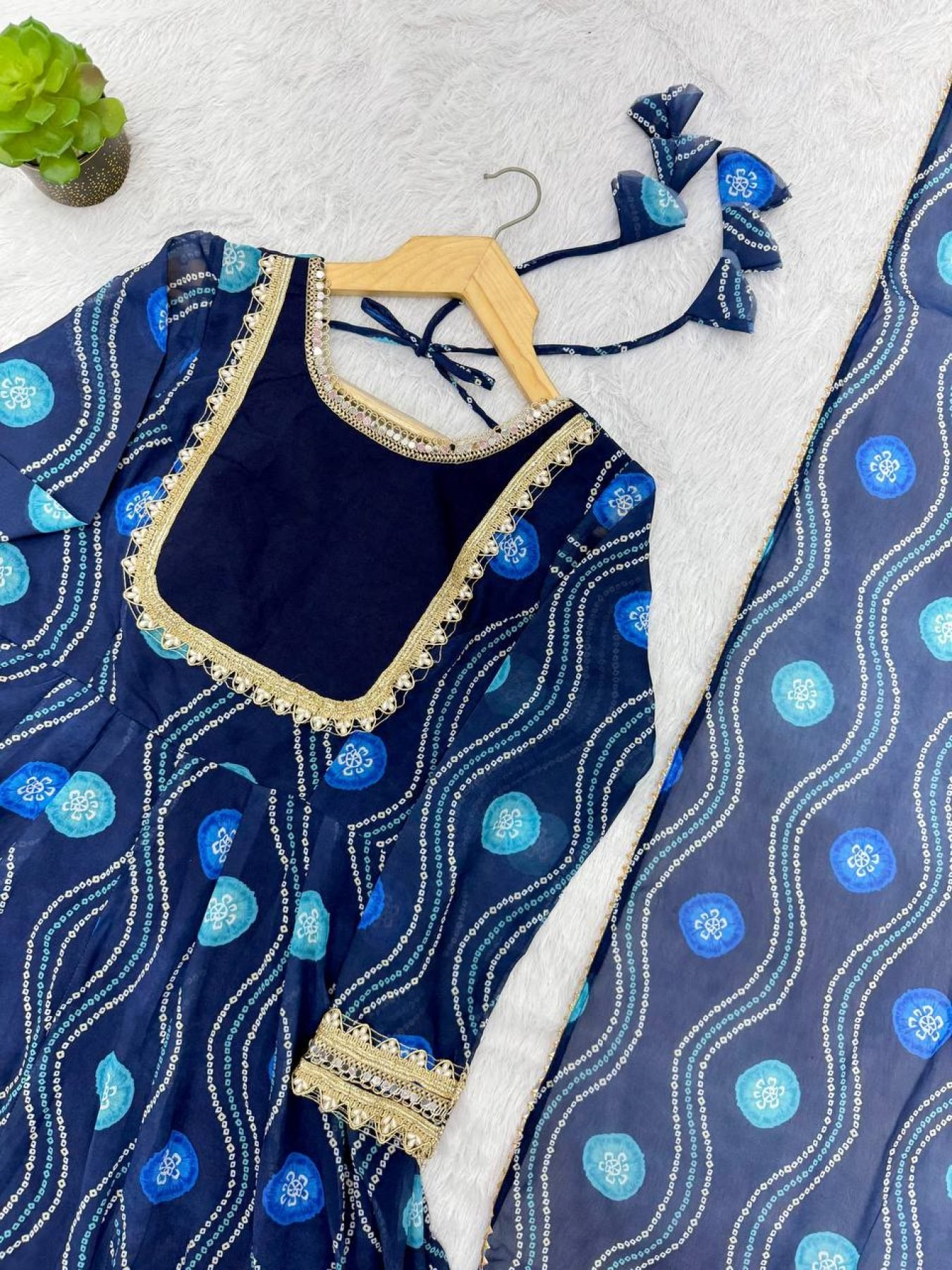 Embellished 4 Mtr Flair Bandhani Fox Georgette Gown with Pant Dupatta at Wholesale Rate for Festive Wear