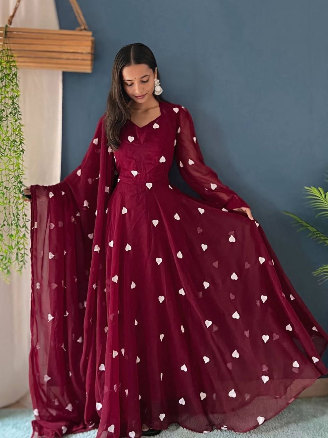Elegant Faux Georgette dress featuring exquisite embroidery work, paired with a matching embroidered dupatta. Comes with fully stitched crepe bottom with elastic waistband for comfort. Available in sizes S, M, and L with a generous 4-meter flair.