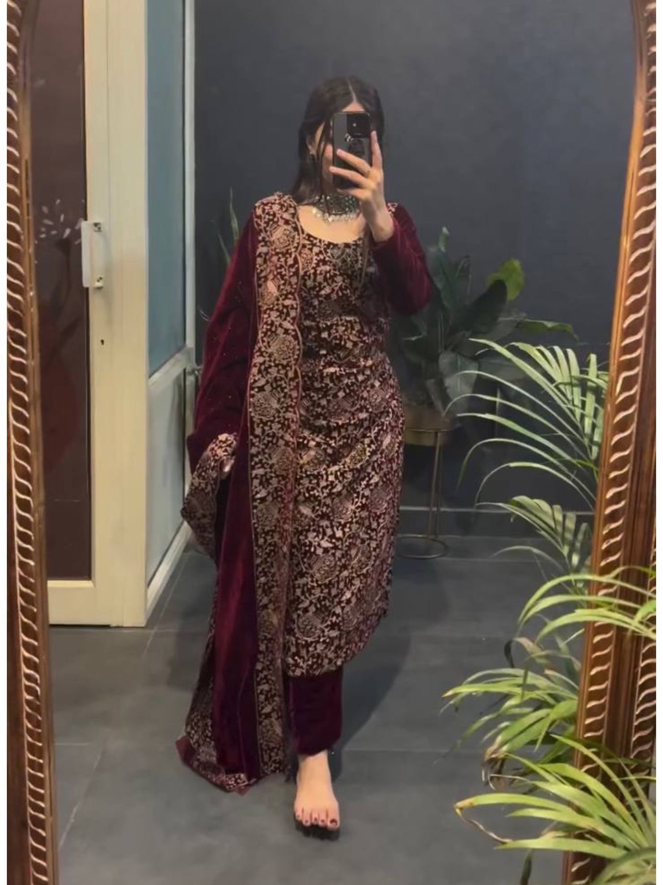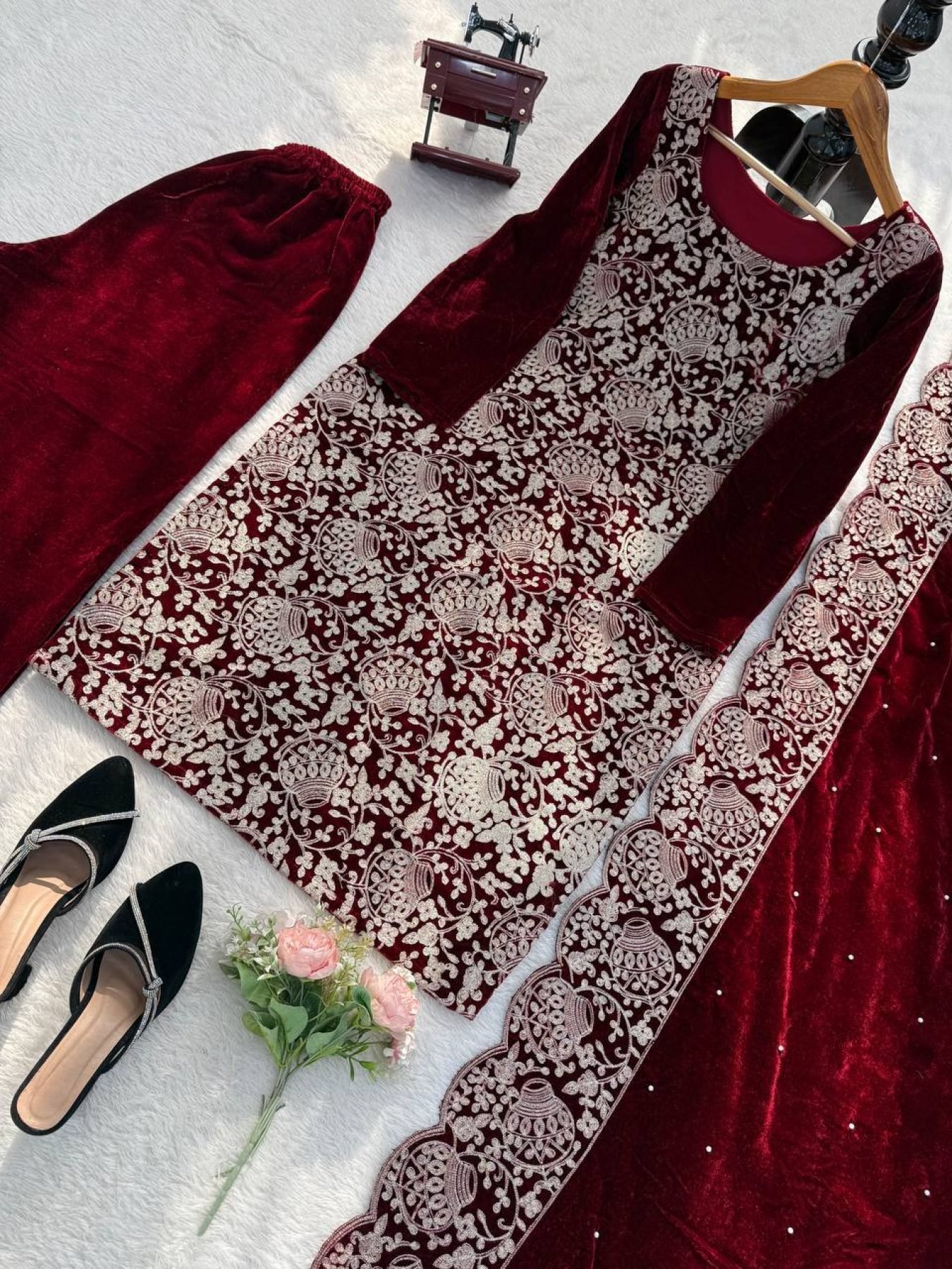 Eye-soothing Viscose Velvet Chinestitch Embroidered Top and Pant with Dupatta for Party Wear at Wholesale Rate