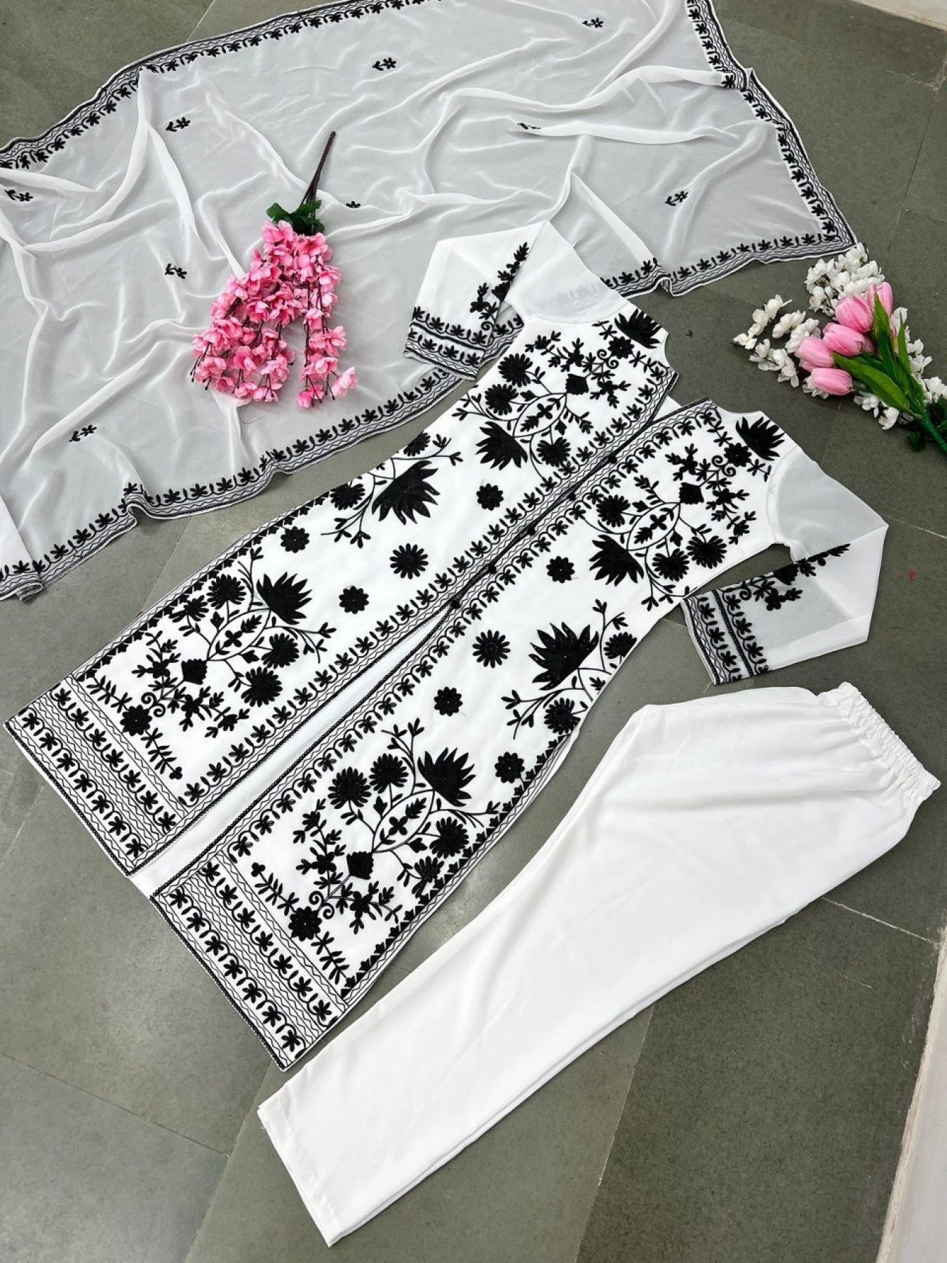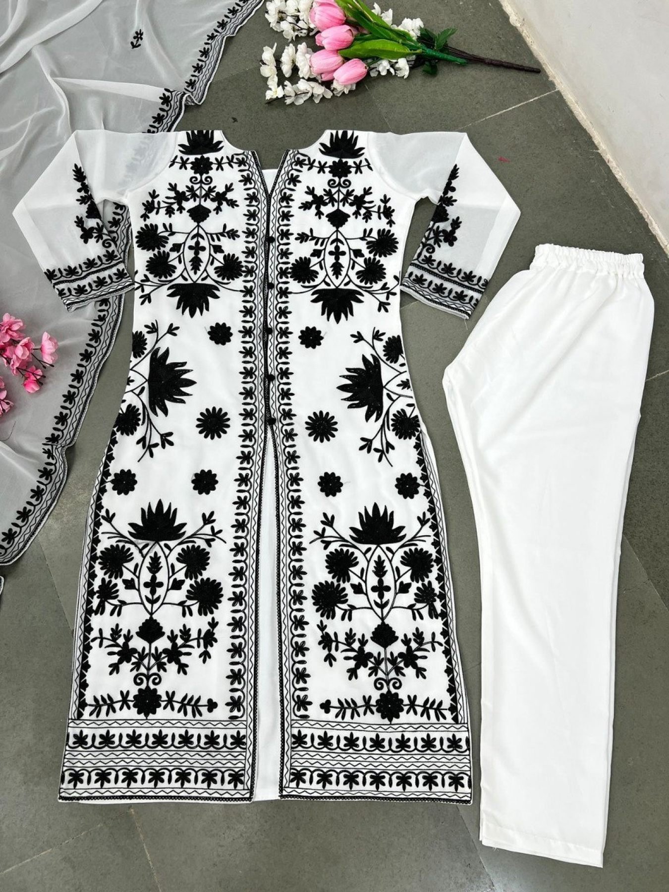 Faux Georgette Kurti Pant Set With Heavy Embroidery Work
