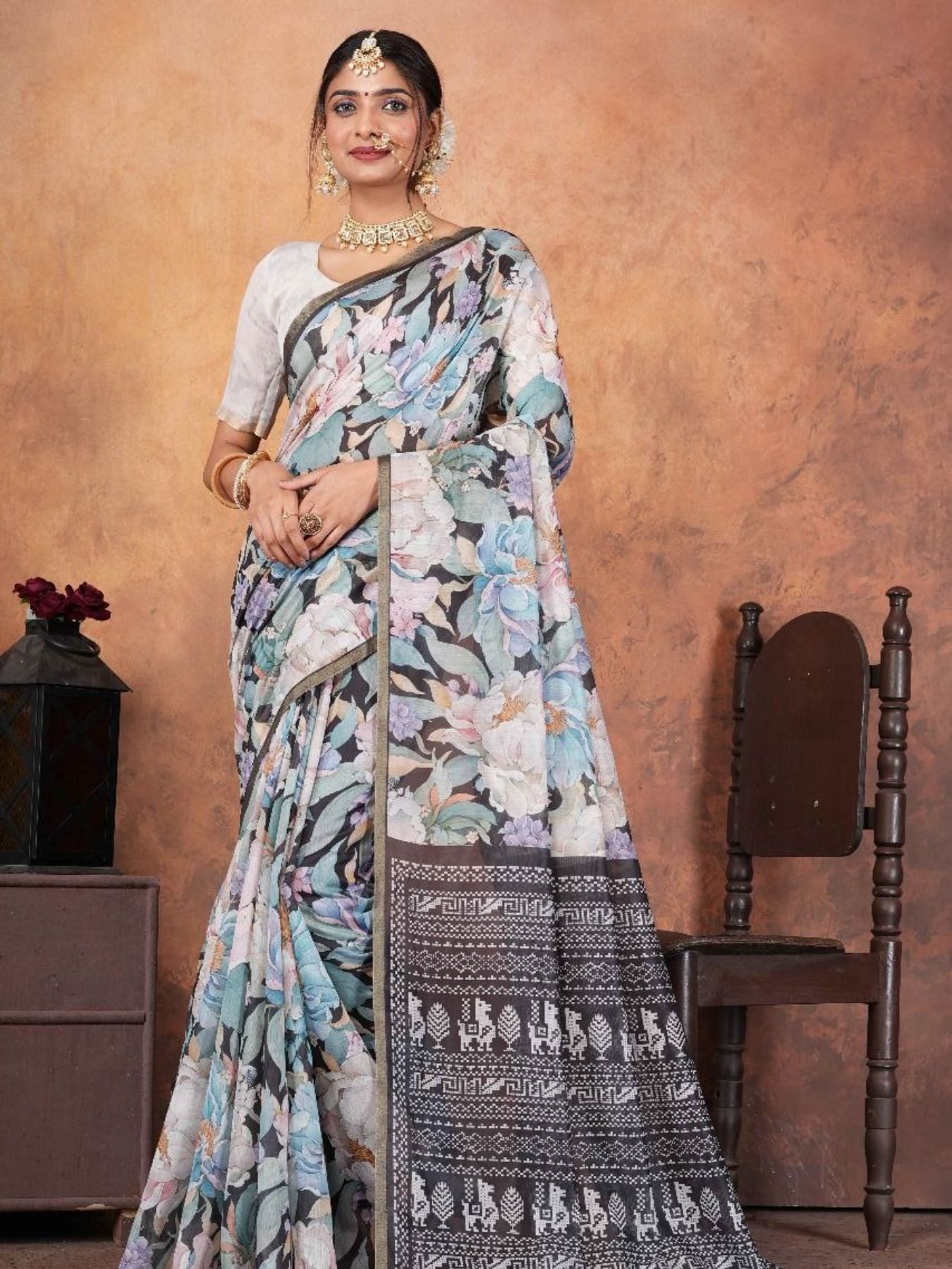 Grace meets tradition with this elegant Chanderi silk saree featuring a rich gold border patti and beautiful digital prints. Comes with a matching digitally printed pallu and blouse. A single-piece designer pick — perfect for boutique clients and premium buyers.