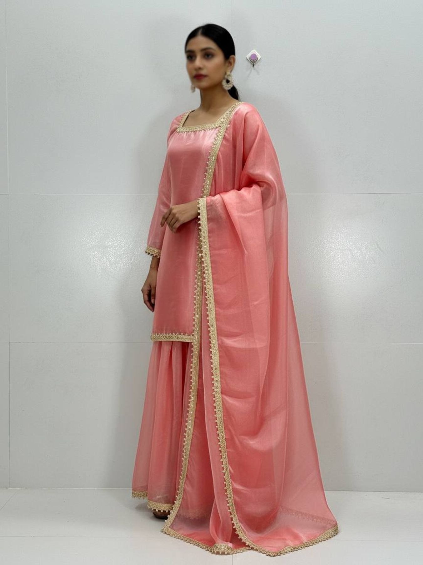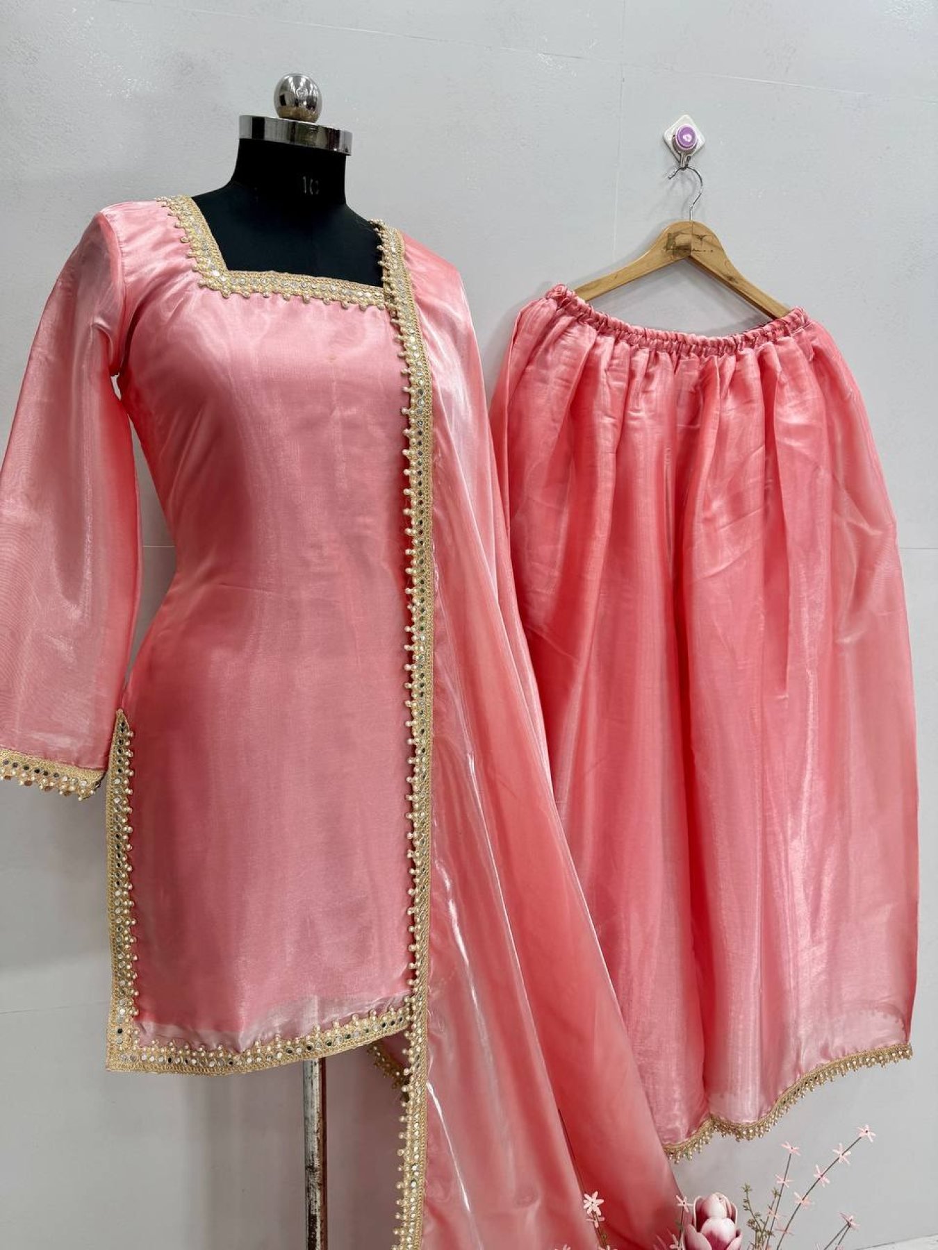 This elegant heavy Fendy silk suit set is crafted with luxurious embroidery coding work and delicate hand finishing. The matching palazzo and dupatta feature rich lace borders, giving the outfit a complete designer appeal. Fully stitched for ready wear, this set is perfect for festive functions, parties, and boutique premium collections. A bestseller option for wholesalers, exporters, and resellers looking for high-quality ethnic sets.