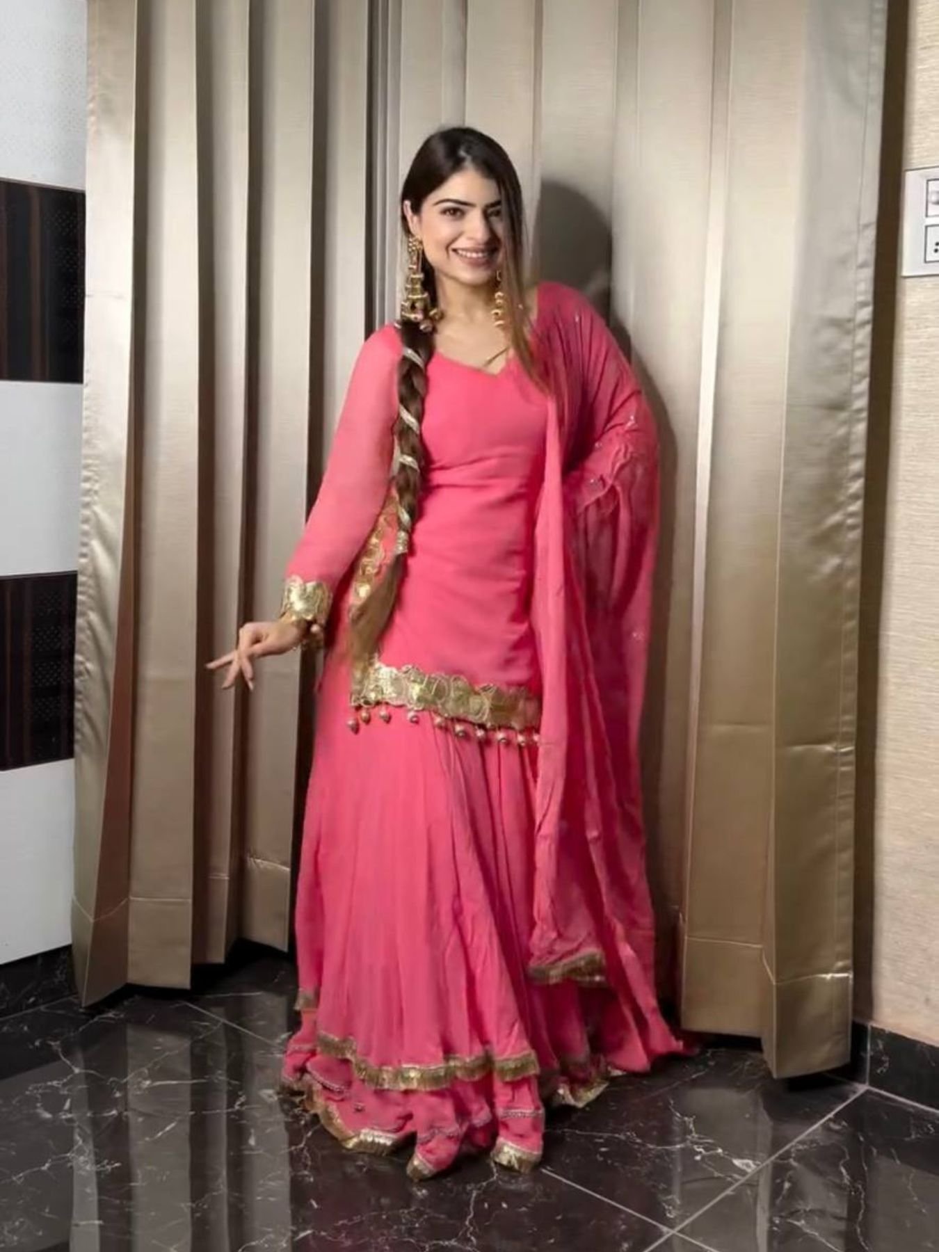Fully Stitched Heavy Chinnon Silk Sharara Outfit with Embroidered Dupatta For Women