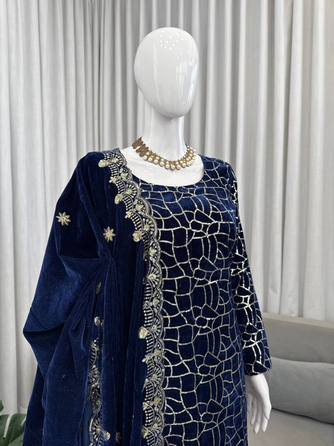 Glorious Velvet Thread and Sequence Work Suit with Matching Pant and Dupatta for Bulk Buyers at Wholesale Rate