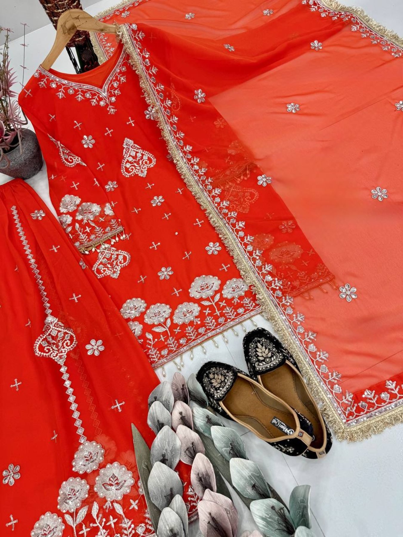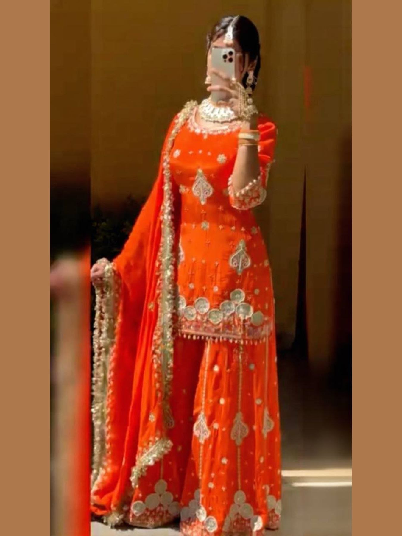 Experience the charm of Heavy Faux Georgette crafted with detailed sequin embroidery, pearl handwork, and elegant lace borders. This fully stitched top with matching palazzo ensures comfort and luxury for festive wear. Completed with a richly embroidered dupatta, this set is ideal for weddings, parties, and celebration events.