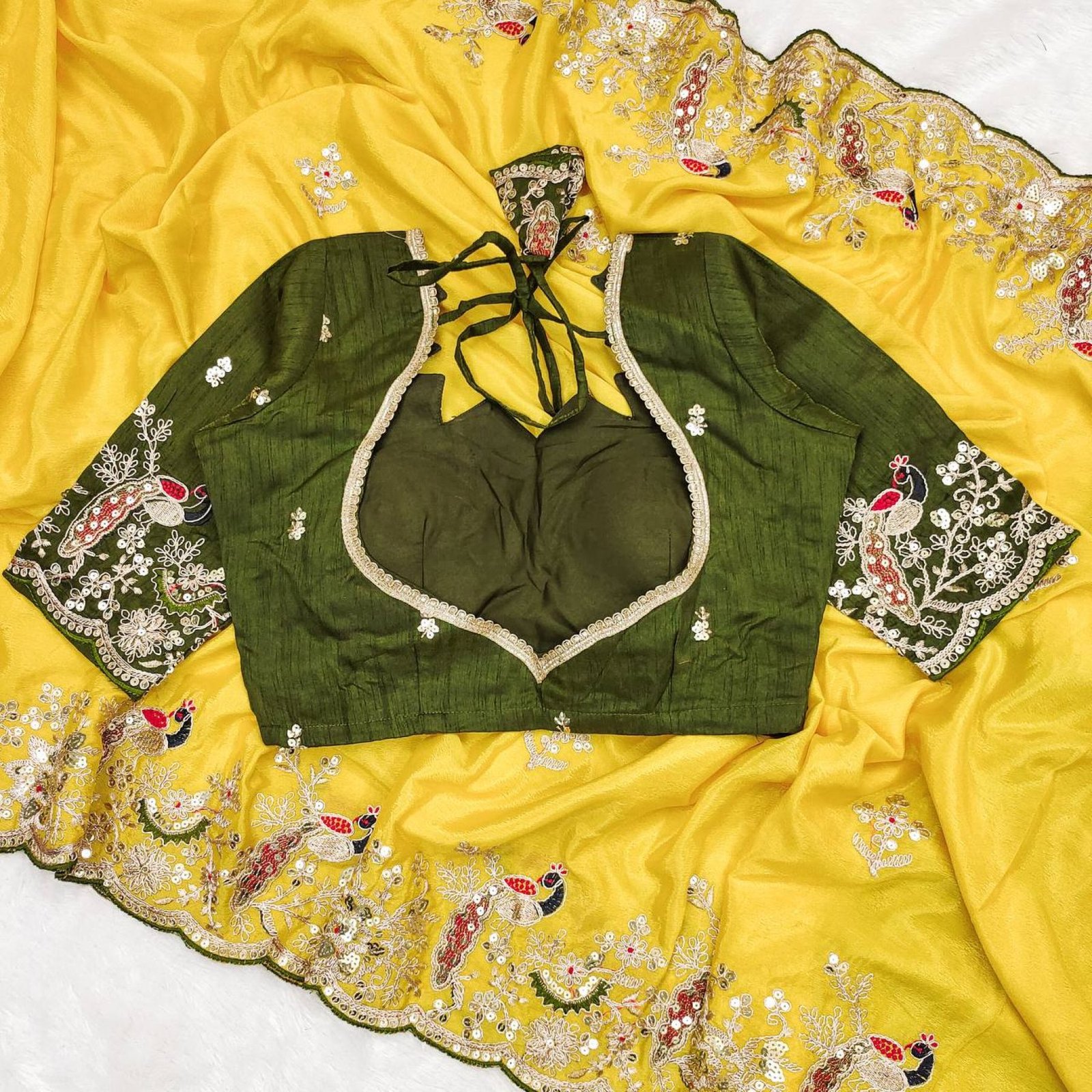 Heavy Chinon Silk Saree with Peacock Cording Embroidery work for Haldi Wear