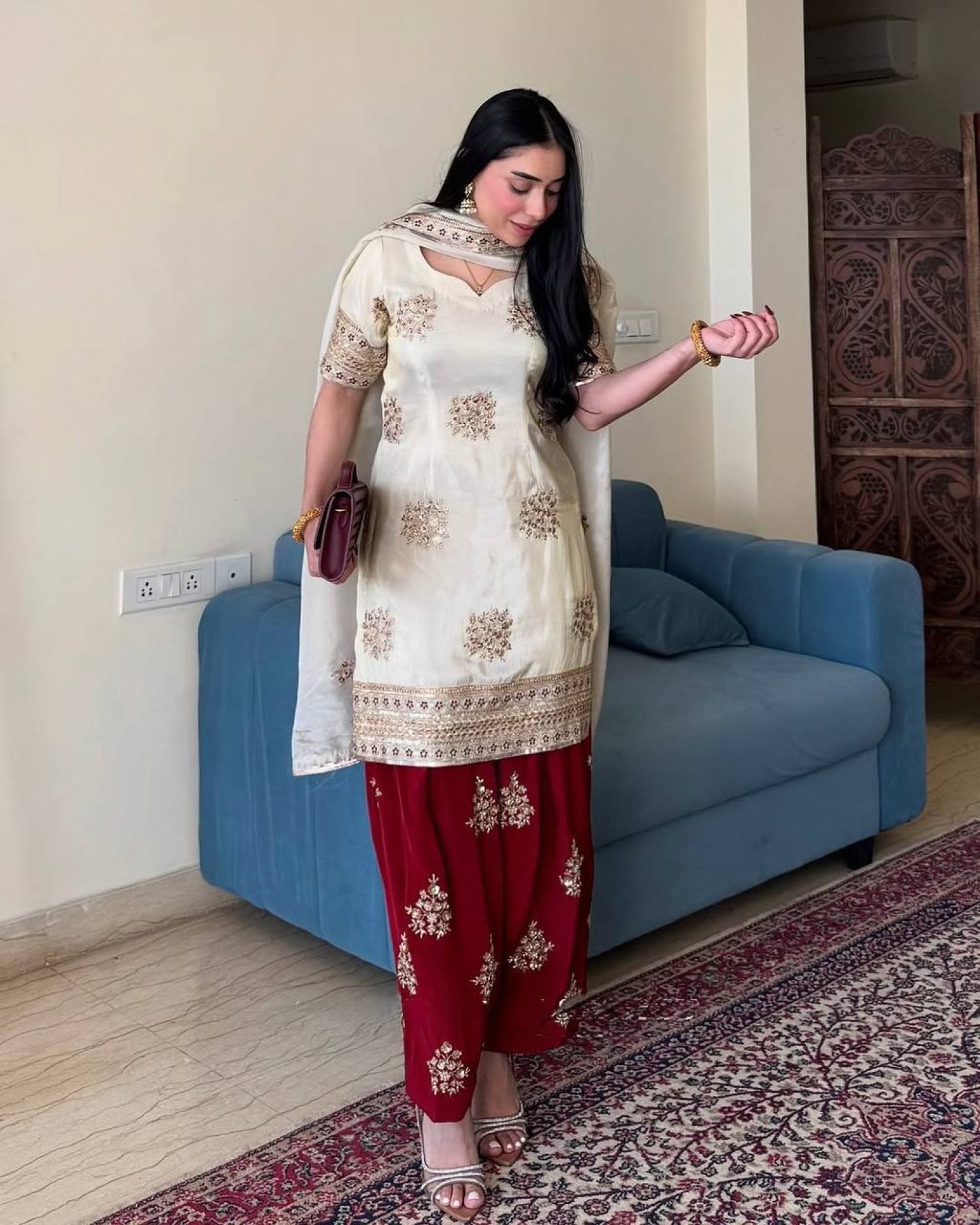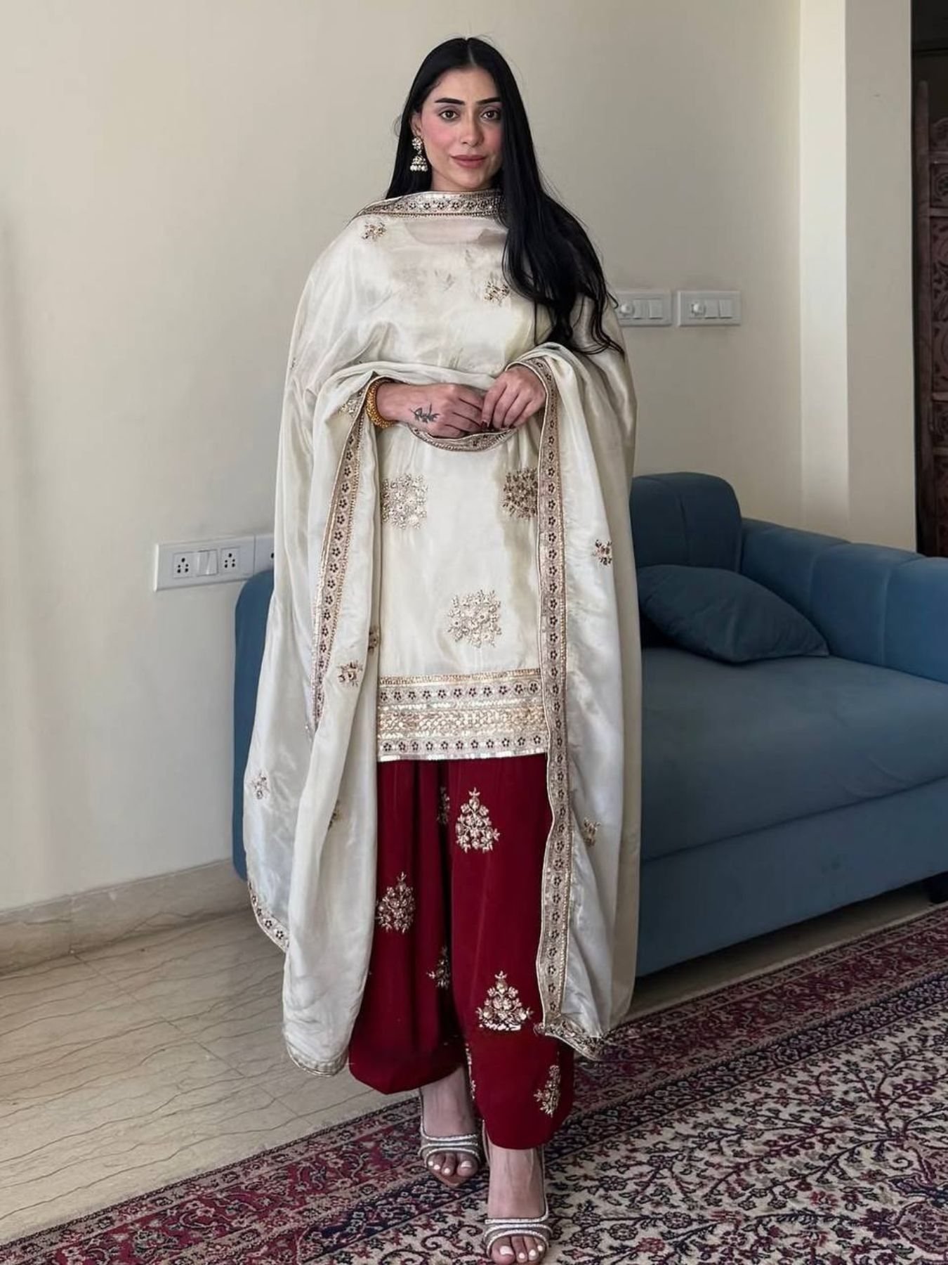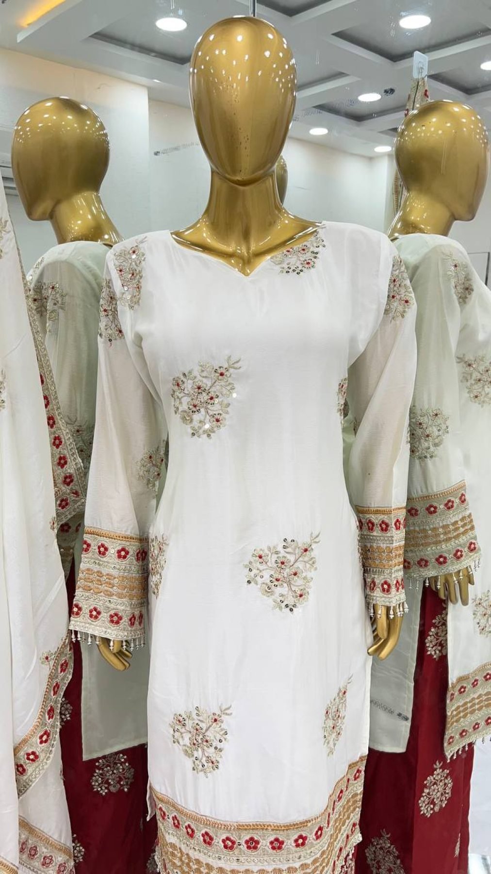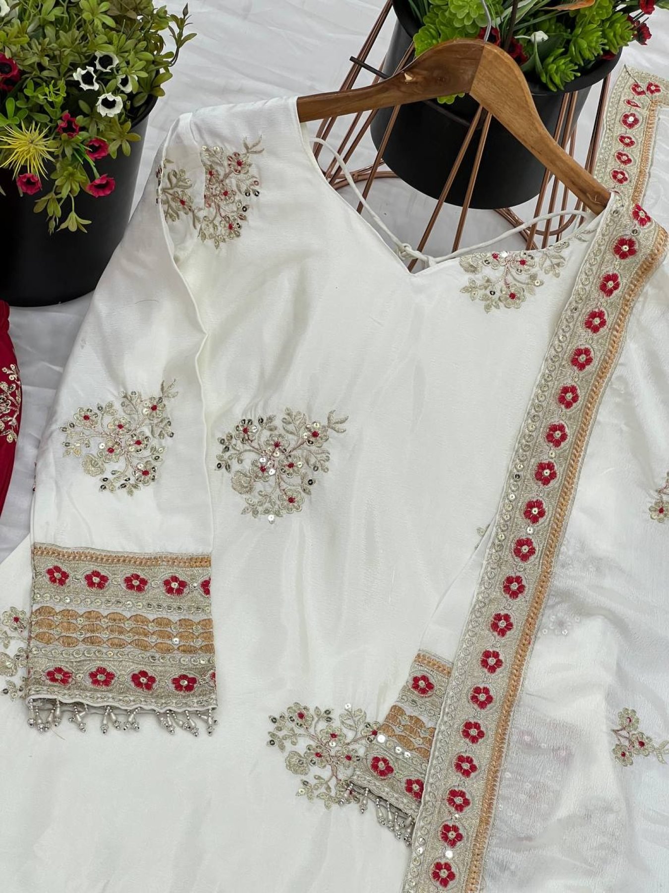 Heavy Pure Chinnon Silk Embroidered Suit Set with Dupatta White Colour