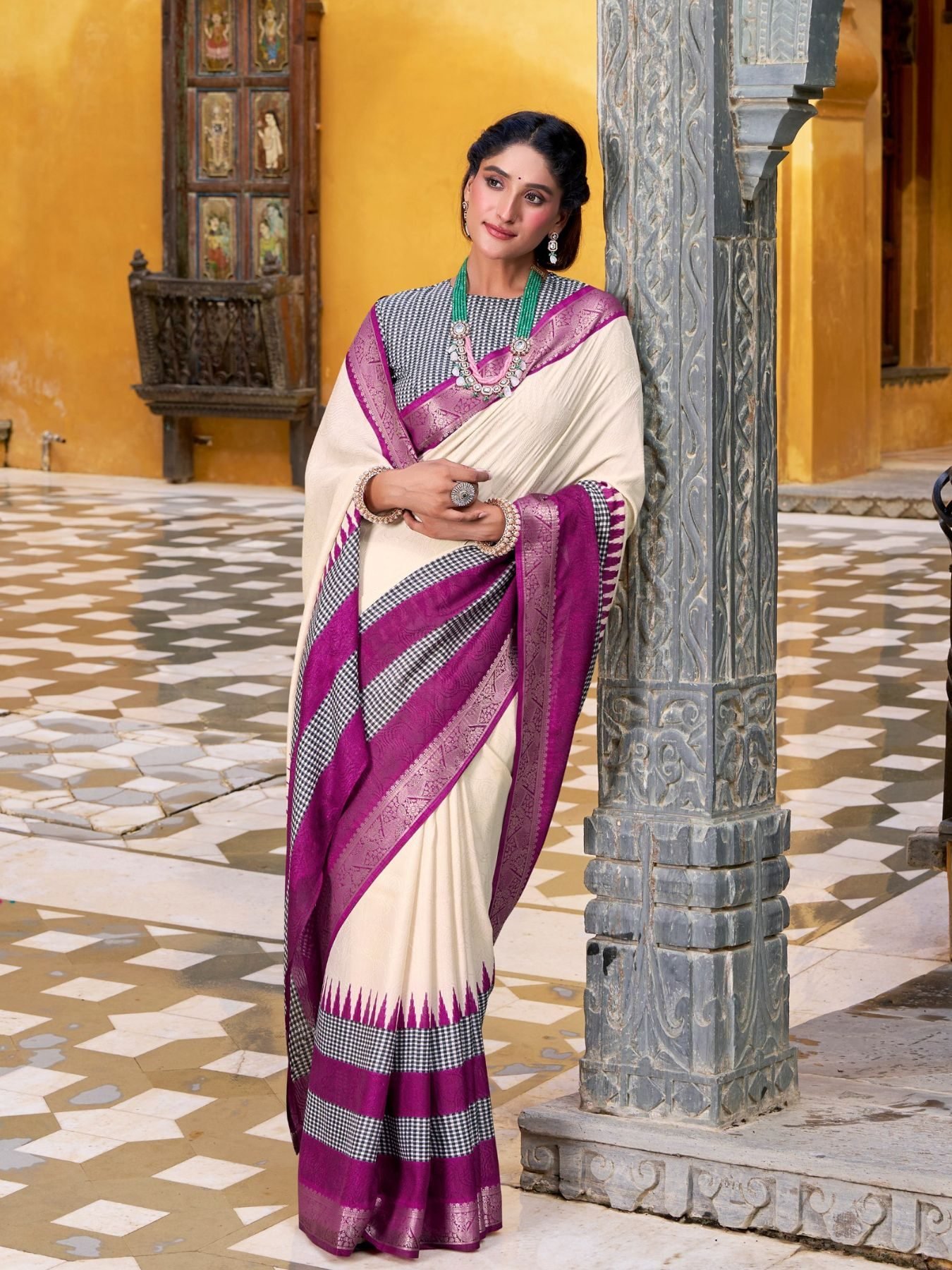 Ivory White Poly Cotton Saree with Purple Border and Zari Weaving Festive Look