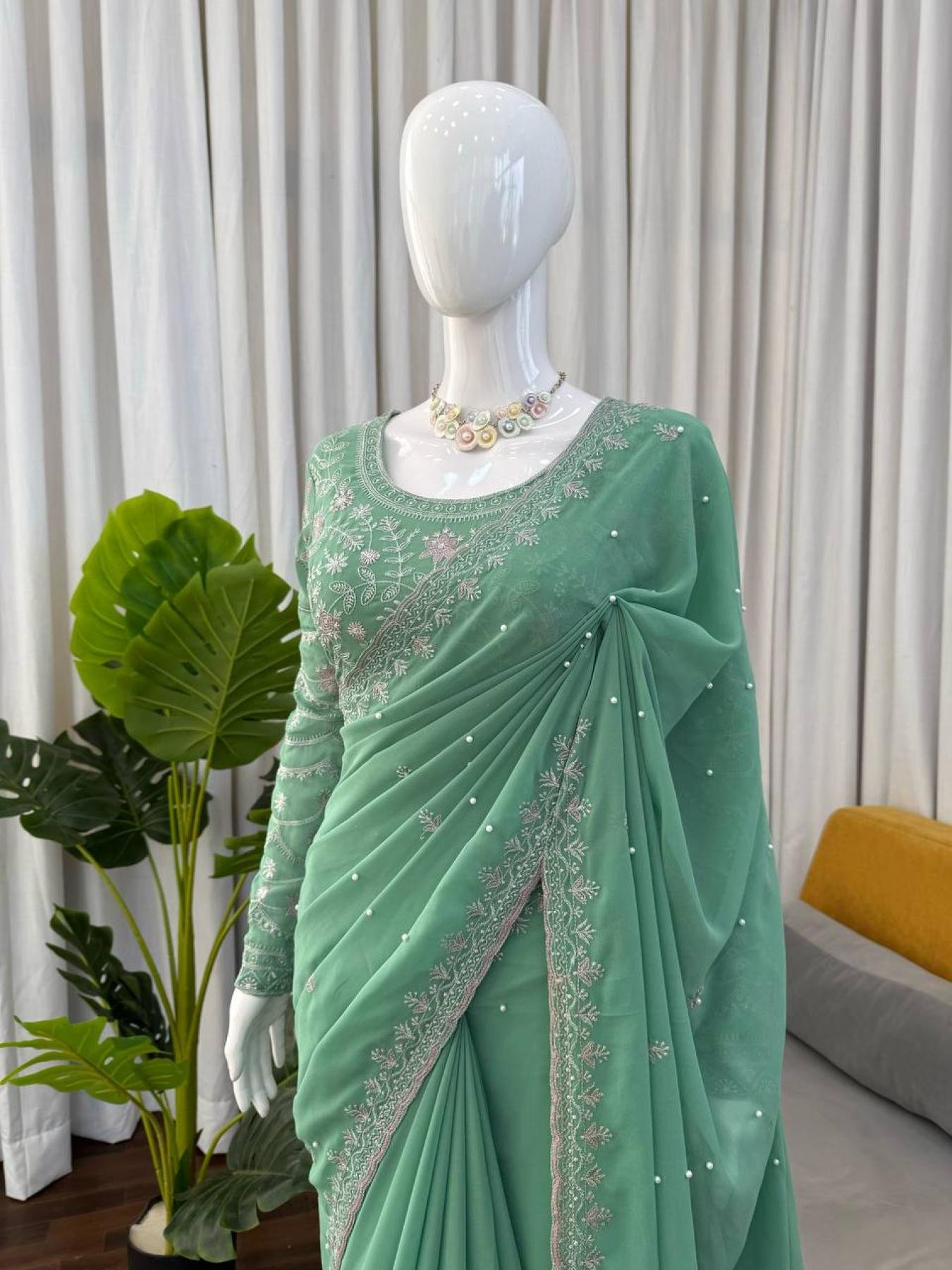 Light Green Faux Georgette Saree with Thread, Sequin and Pearl Work with Full Sleeve Blouse