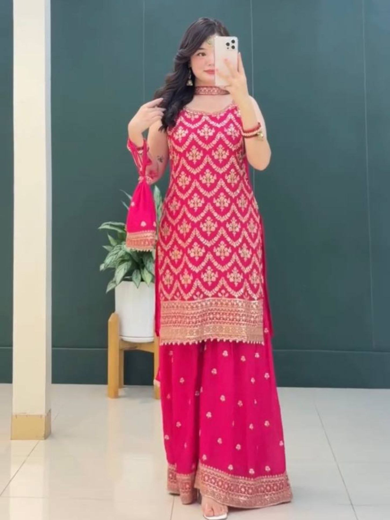Luxury Faux Georgette Palazzo Suit with Embroidery Dupatta and Potli Party Wear