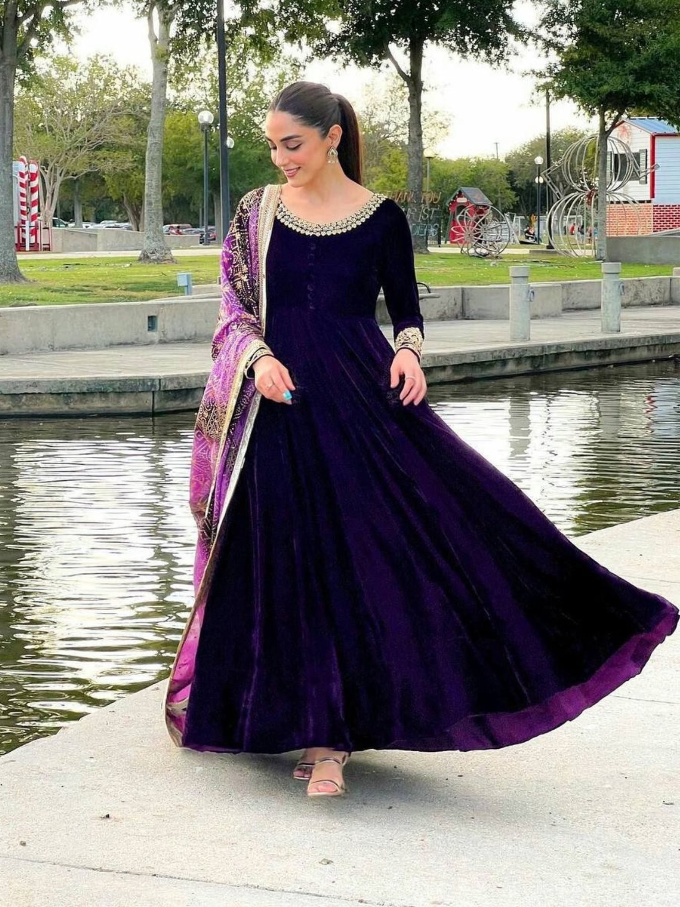 Magnificent Velvet Embroidered Long Gown With Sequins Work Designer Dupatta Perfect for Winter Party Wear