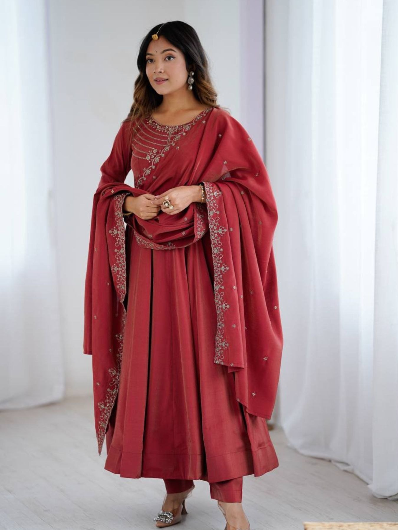 Maroon Roman Shimmer Silk Anarkali Suit with Dupatta Diwali Wholesale Collection