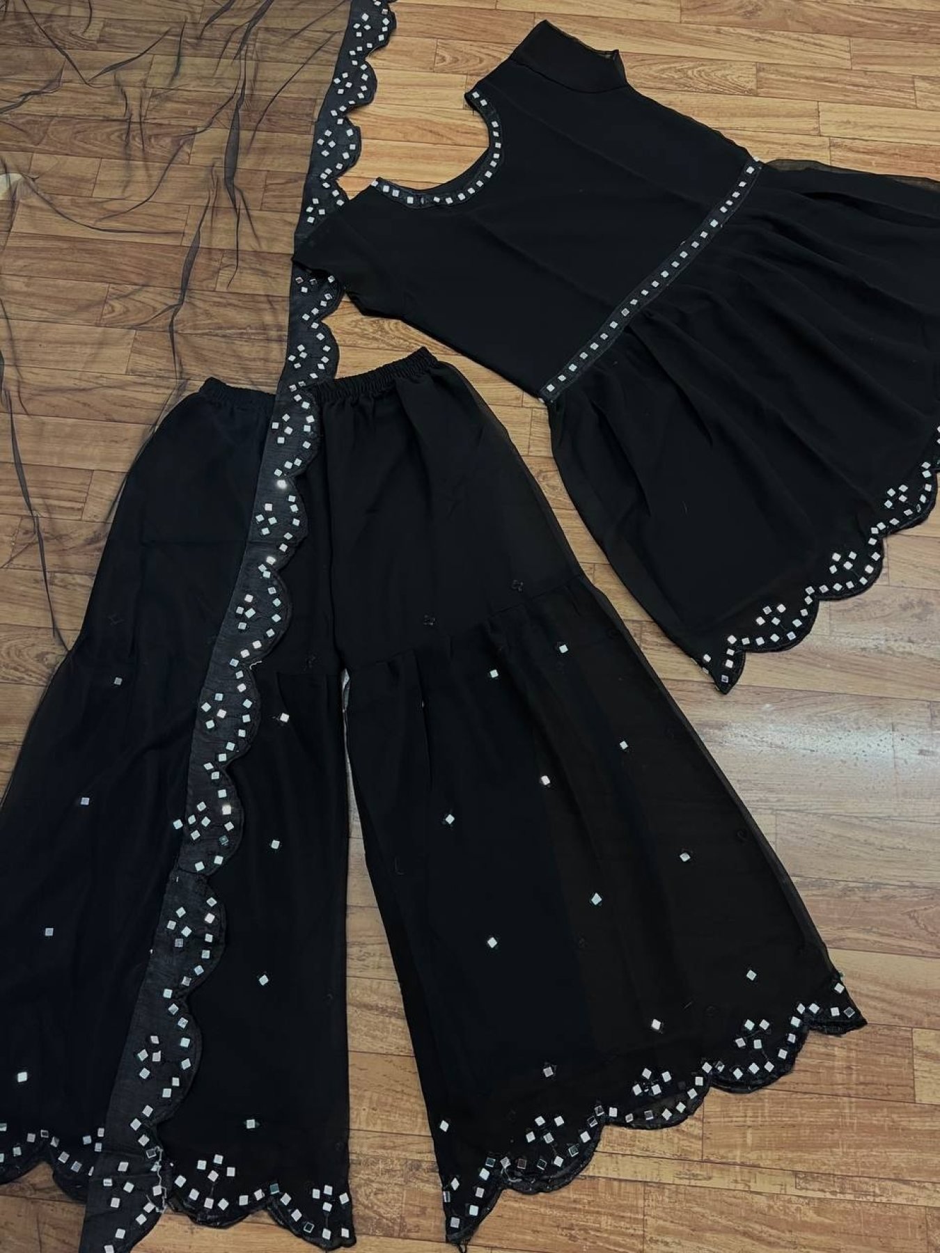 SARARA PLAZZO:- FAUX GEORGETTE WITH EMBROIDERY WORK WITH REAL MIRAL HAND WORK