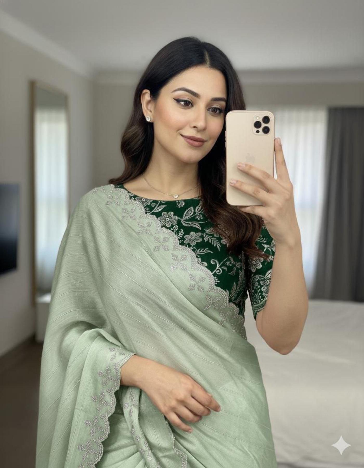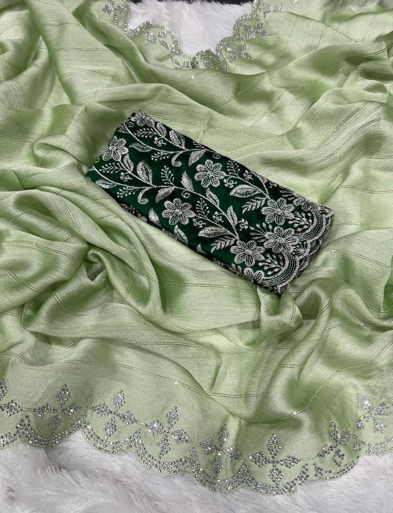 Introducing our New Arrival Moss Chiffon Saree, featuring a luxurious siroski sequence border for a stunning party-wear look.