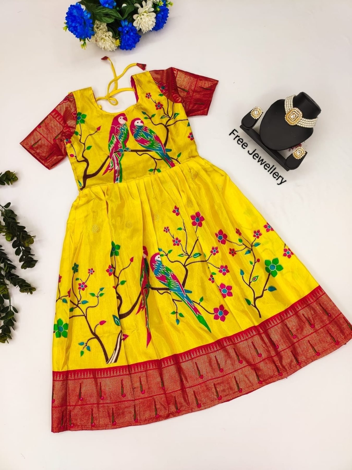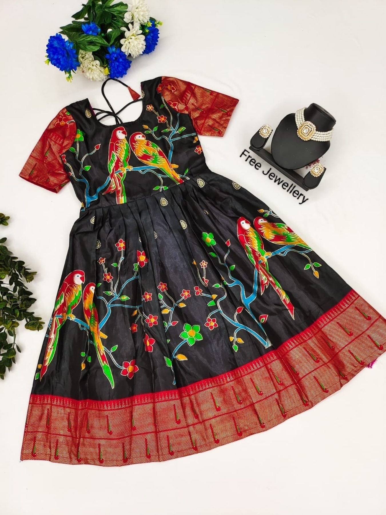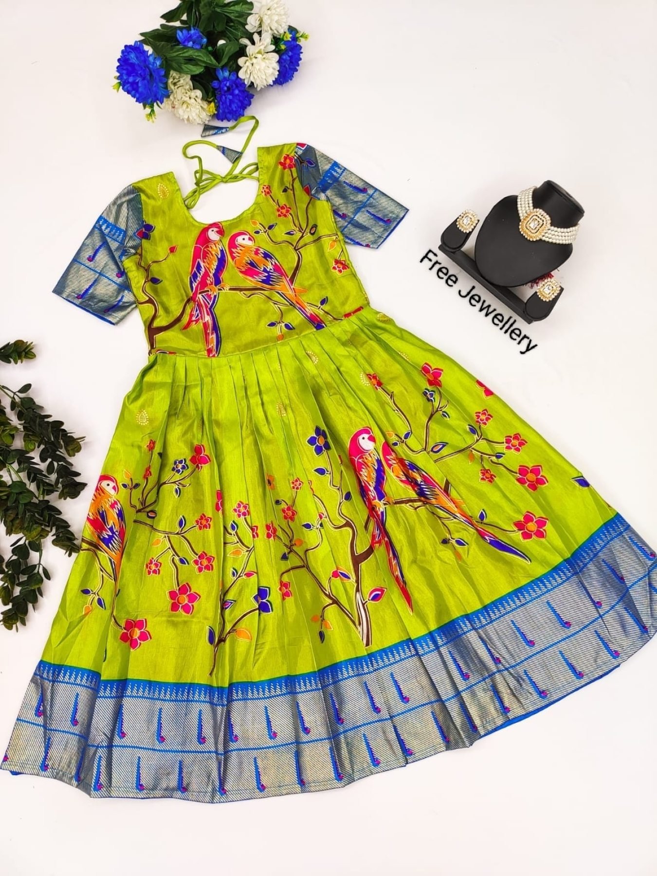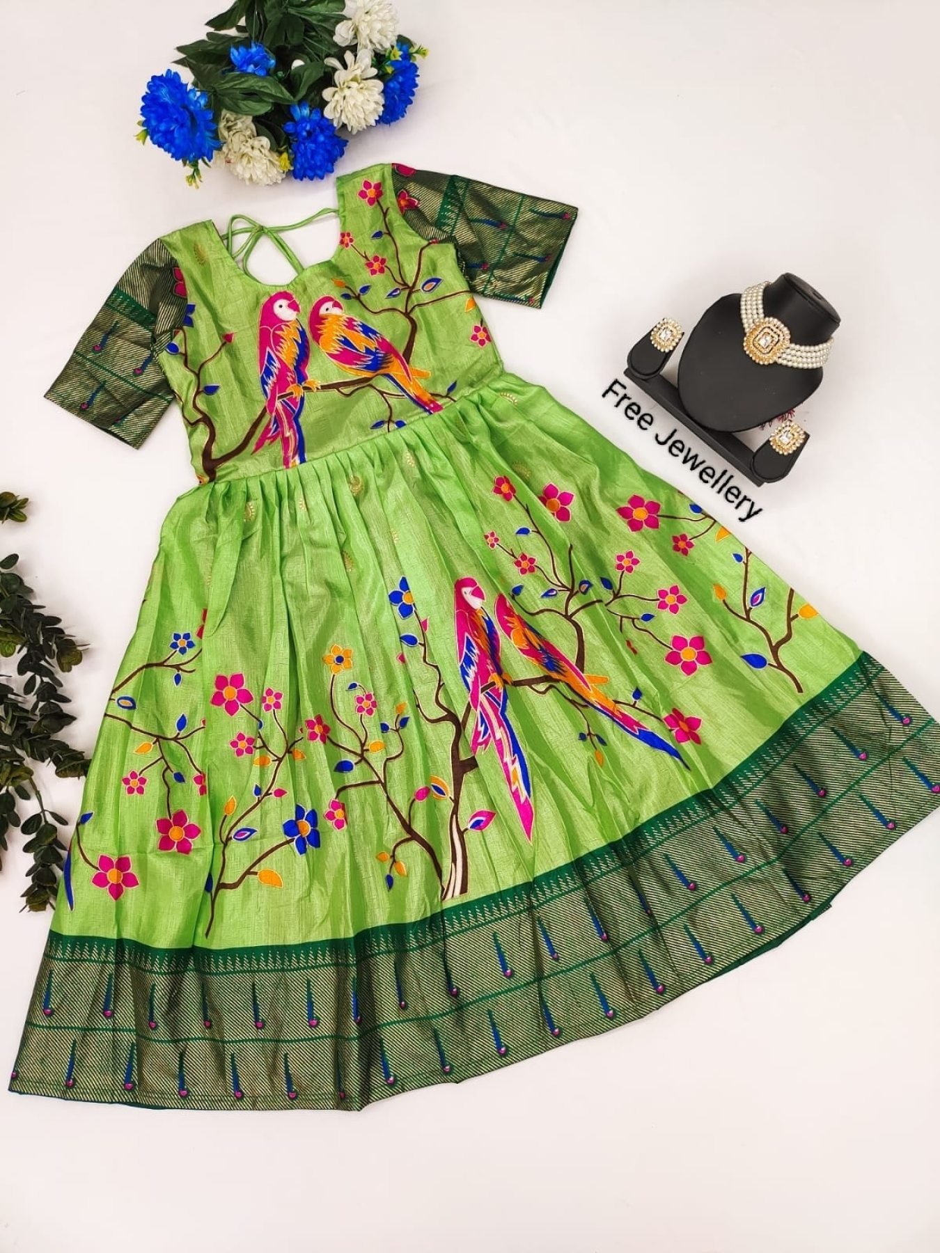 New Launching Kids Top Selling Zari Foil Work Parrot Stitched Gown & Dupatta