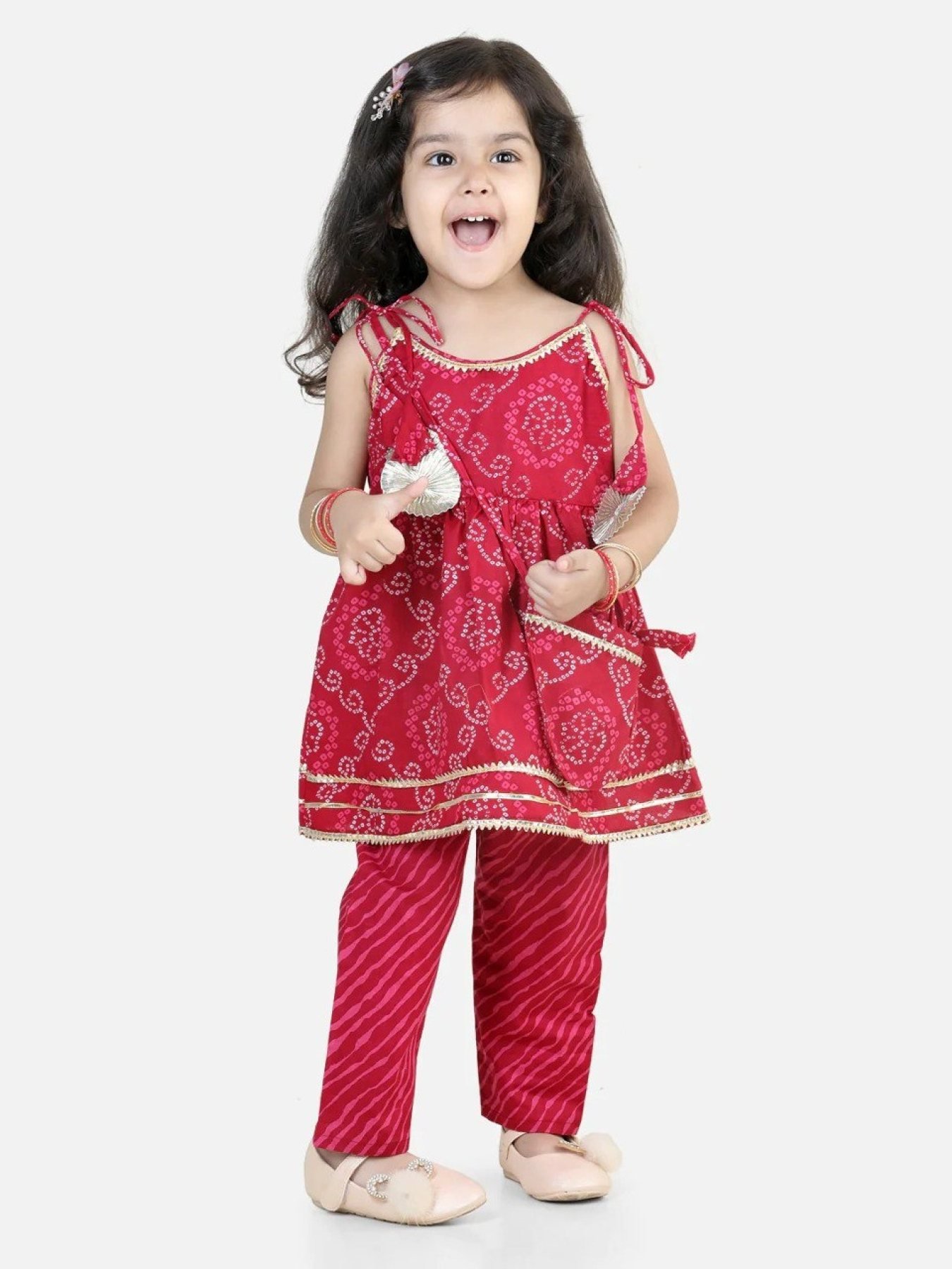 Pink Cotton Printed Off Shoulder Kurti Pant Set