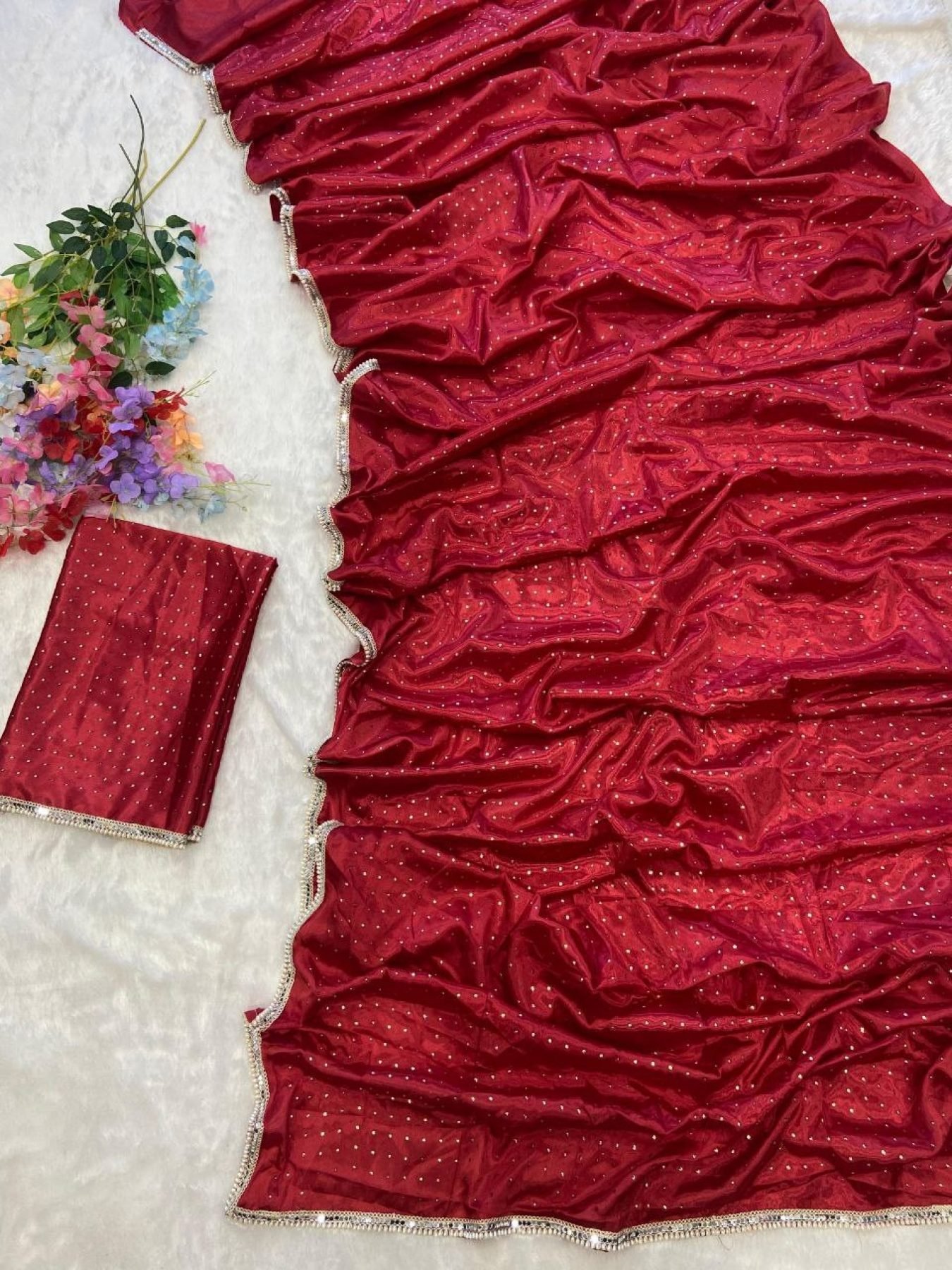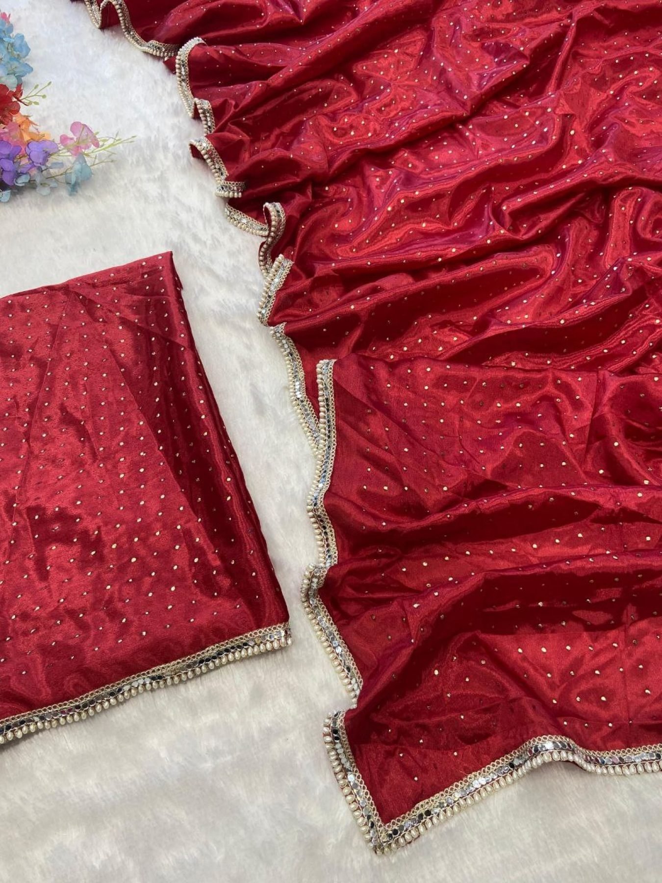 Blouse : *Premium Chinon Silk With Mukesh Work And Beautiful Handwork Lace* ( Unstiched )