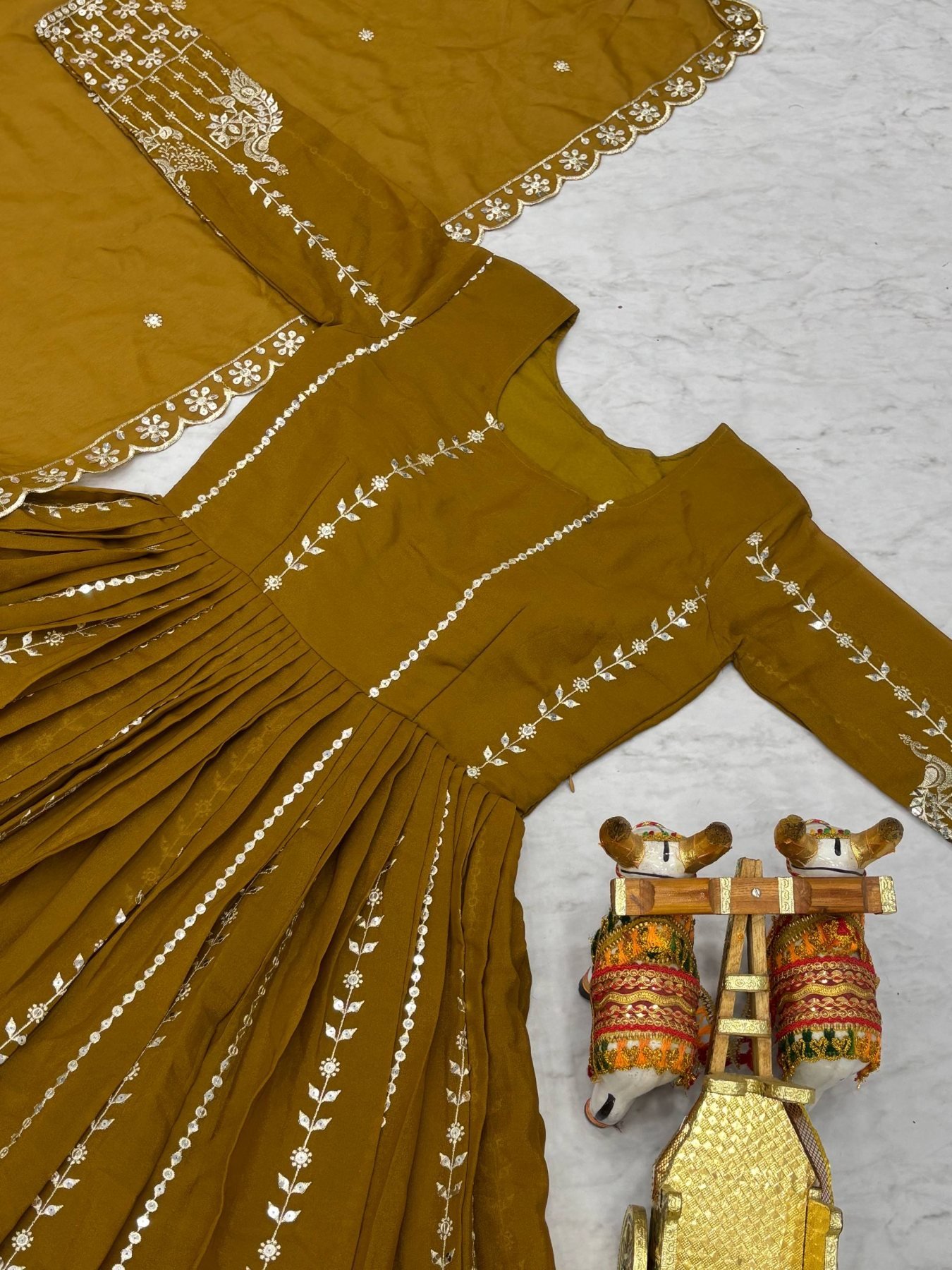 Make a statement at weddings, receptions, and festive occasions with this fully stitched designer gown set. Crafted in premium star georgette with heavy 7mm sequins embroidery work, it offers a rich festive flair. Paired with a matching embroidered dupatta, this gown is the perfect blend of elegance and modern fashion.