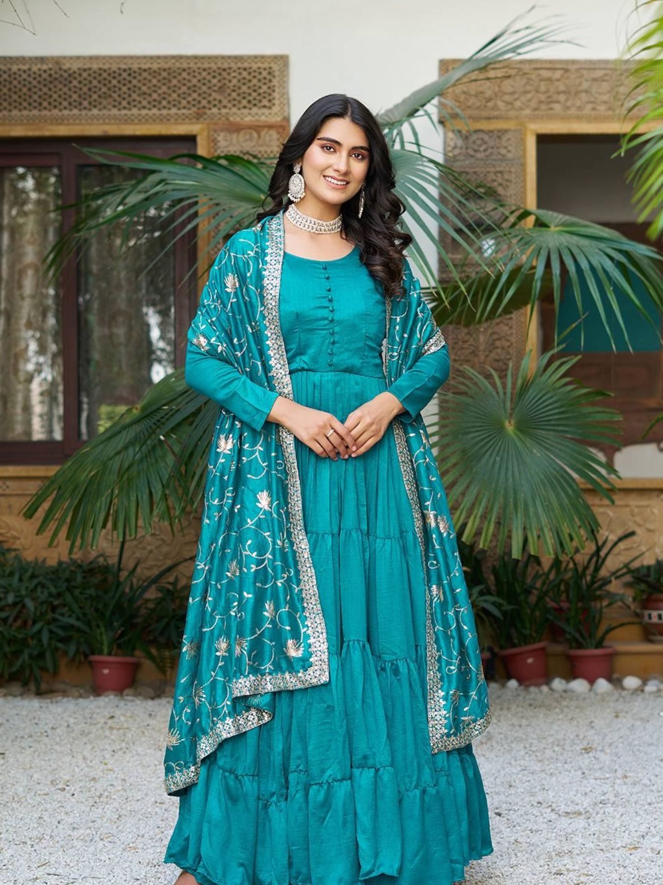 Premium Vichitra Silk Anarkali Gown with Heavy Sequence Embroidery Matching Dupatta Set