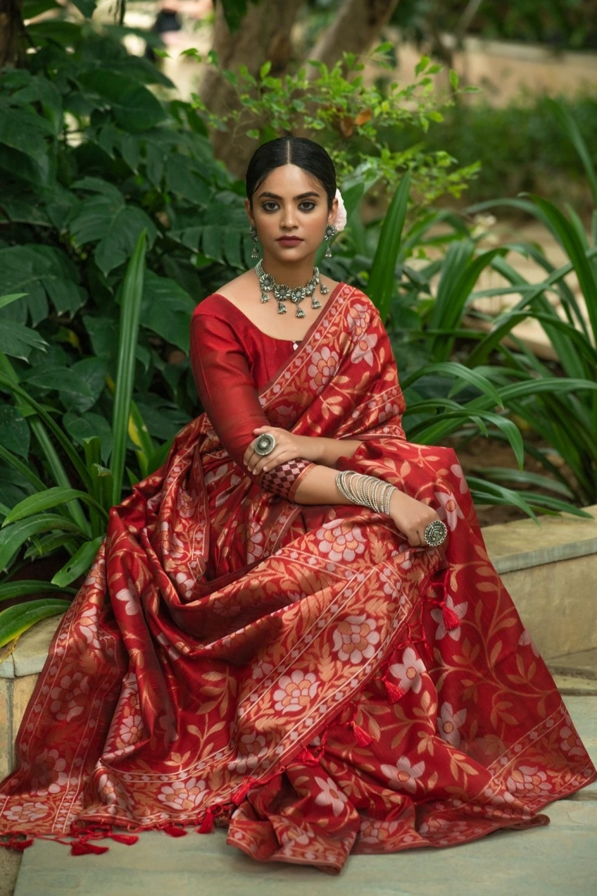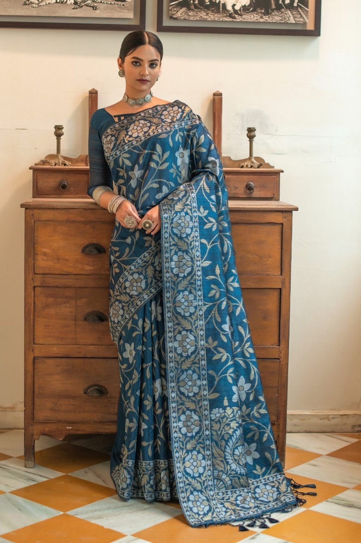 Pure Tussar silk jamdani weaving saree with zari woven border ,pallu and blouse piece with exclusive Tassels