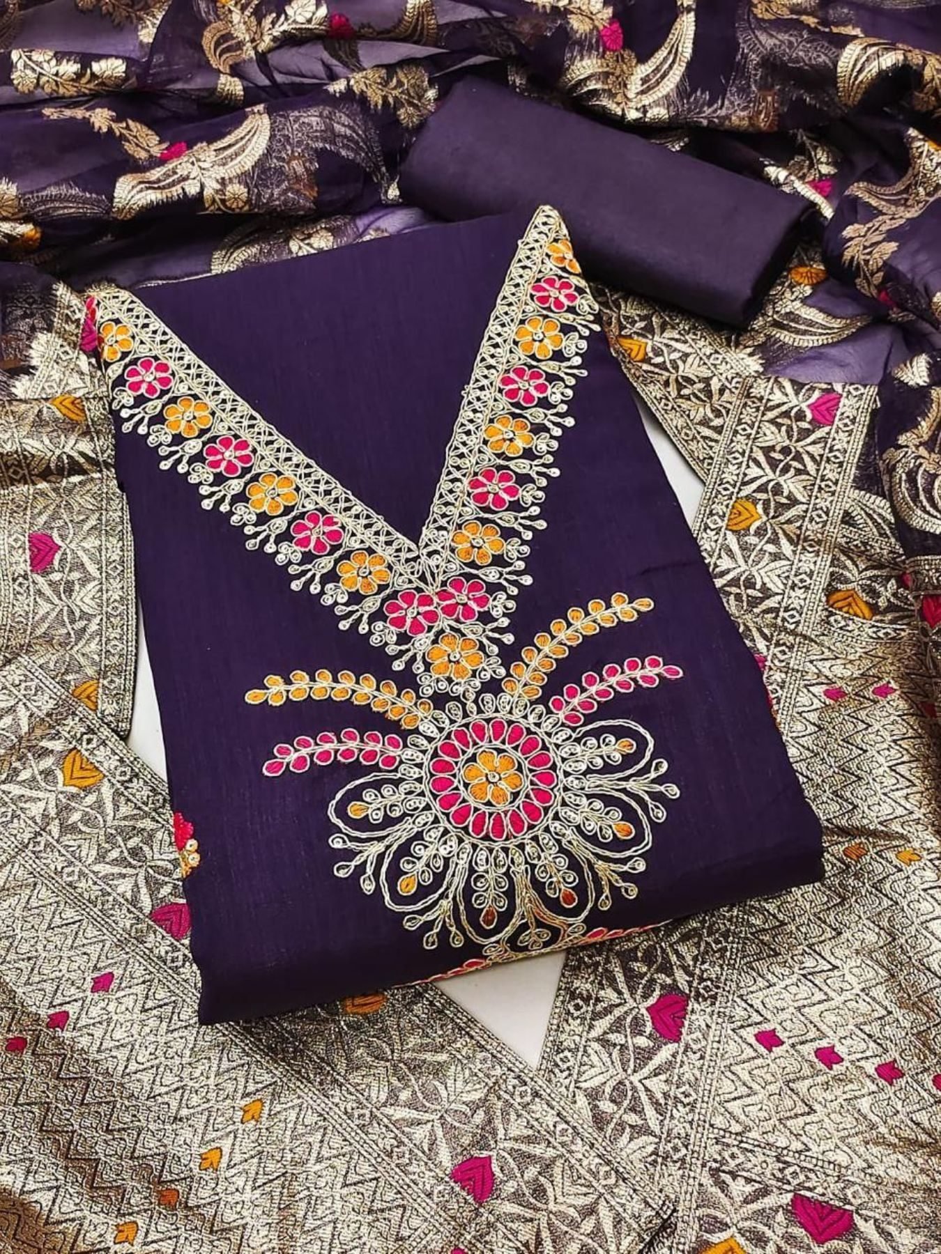 Purple Vichitra Silk Dress Material with Coding and Sequence Work Party Wear