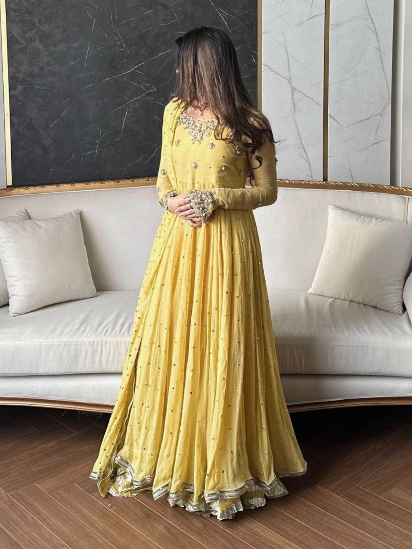 This faux georgette gown set showcases intricate 5mm sequins and zari embroidery with elegant lace finishing. Designed with soft micro lining and stylish back dori detailing for a premium festive look. A perfect choice for wedding and party wear collections.