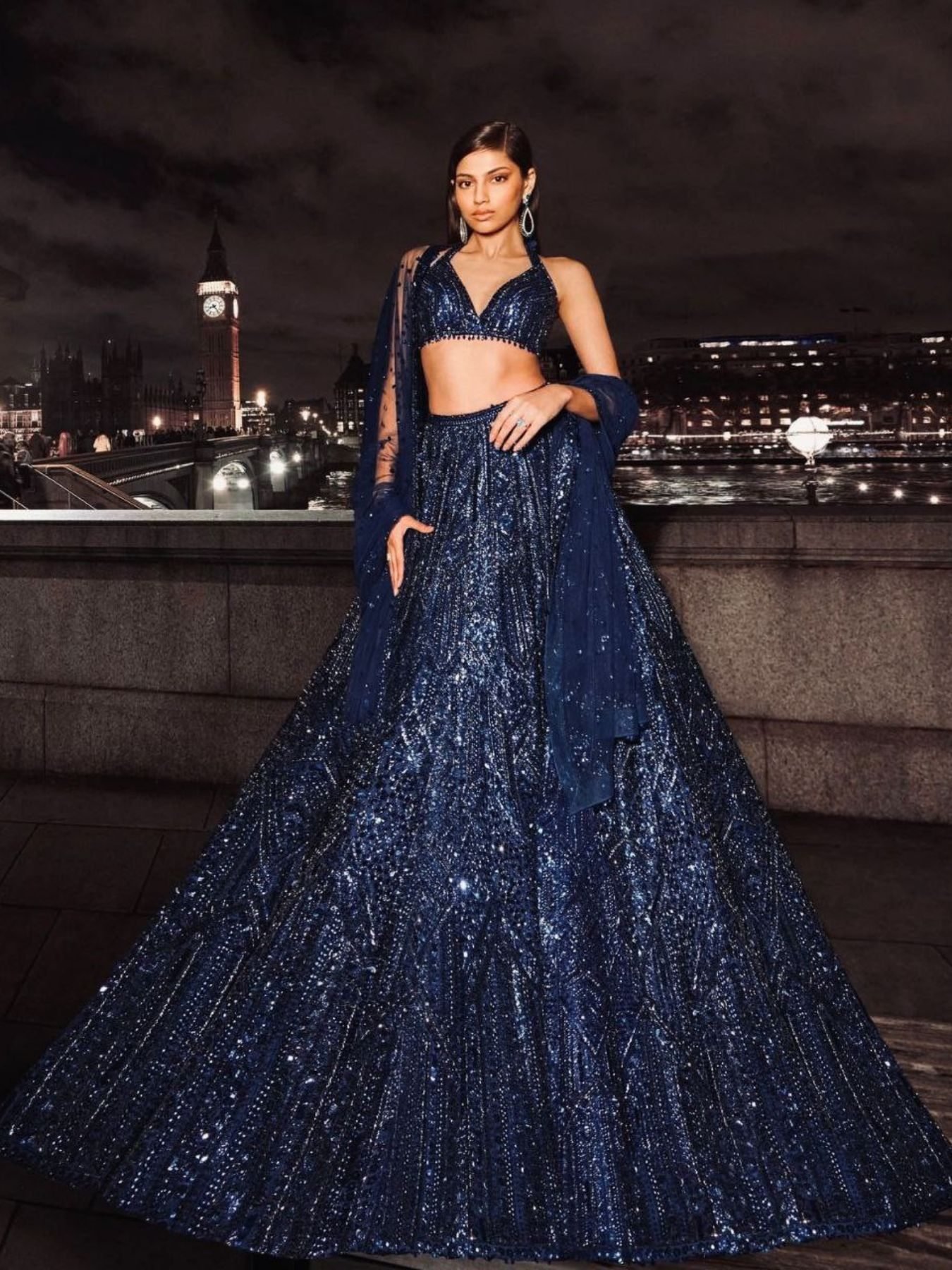 Reception Wear Navy Blue Designer Net Lehenga with Heavy Work at Low Price