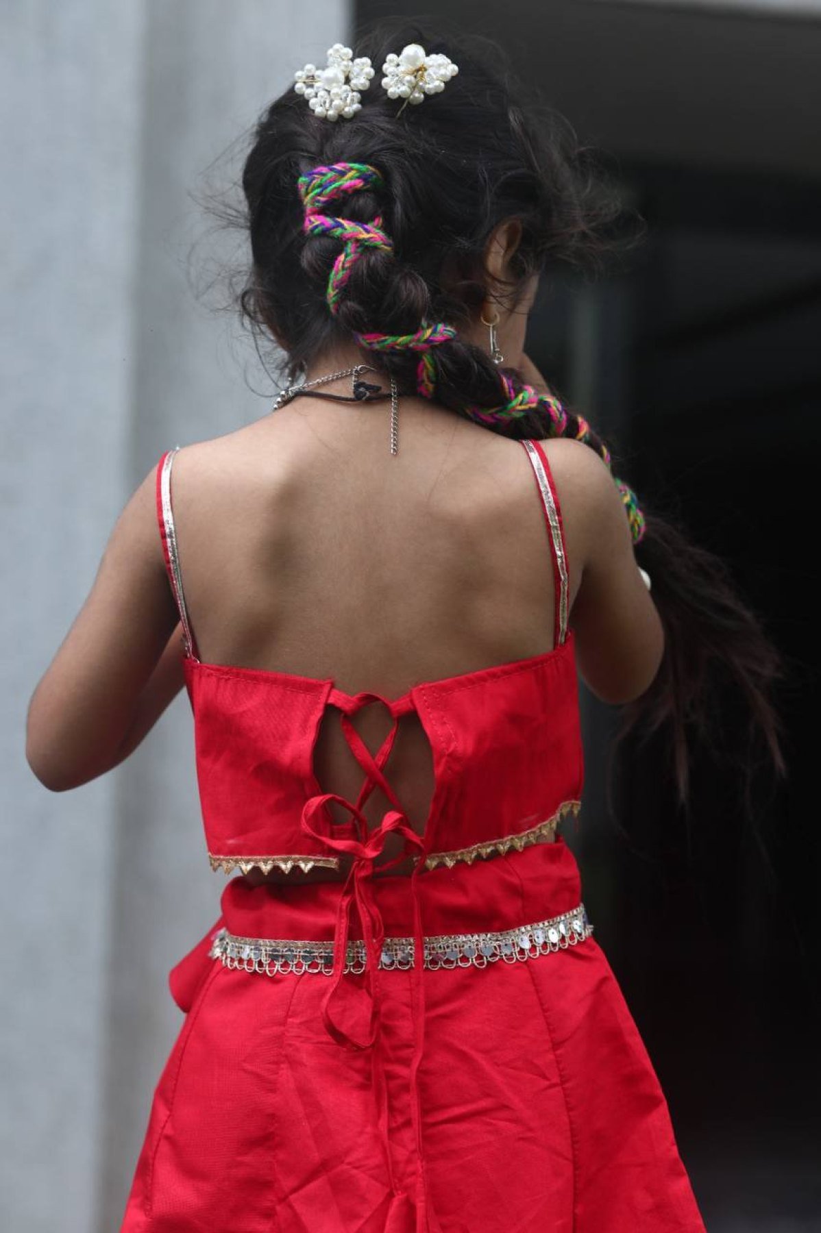Red Premium Roman Silk Kids Garba Lehenga Choli Festive Celebration Wear