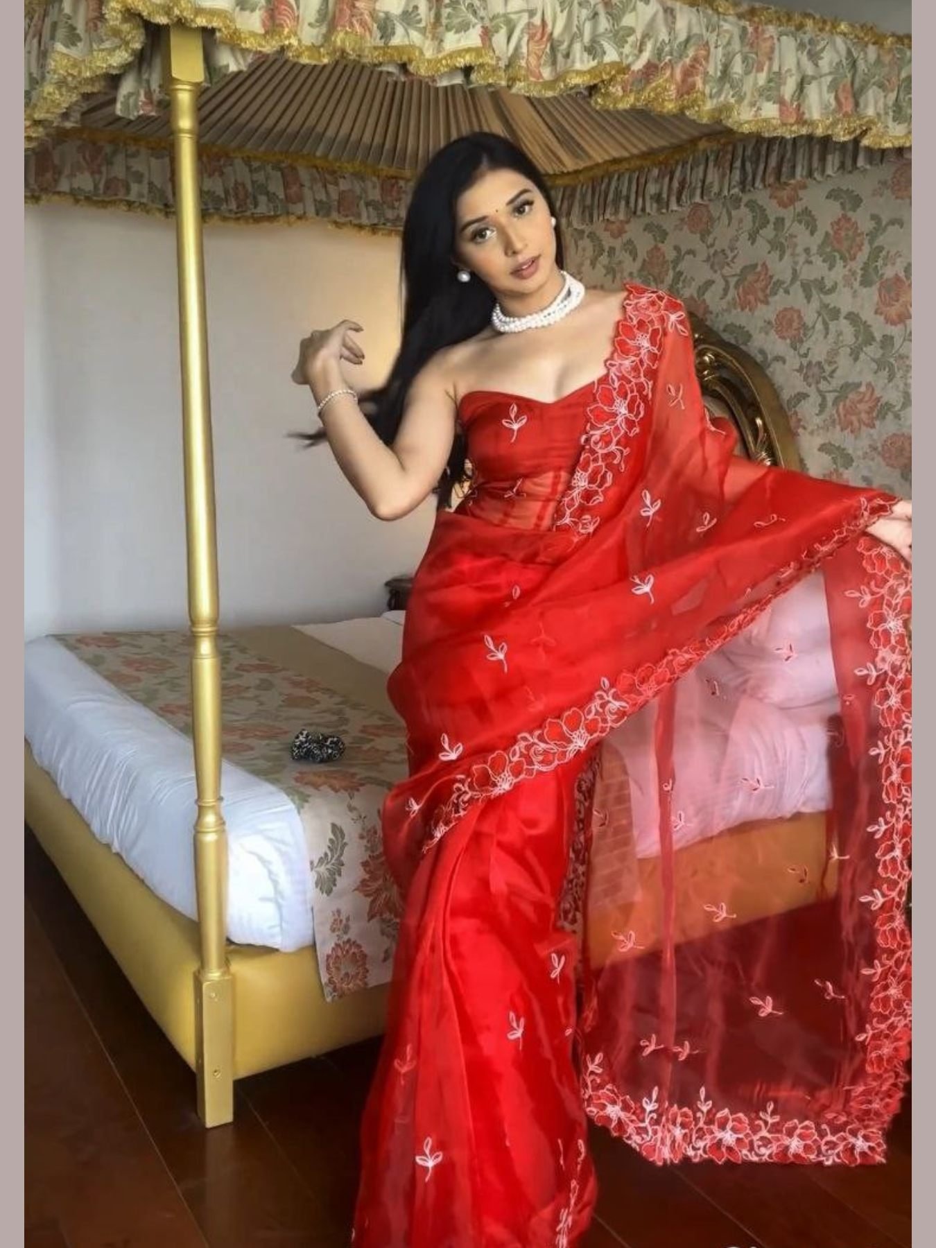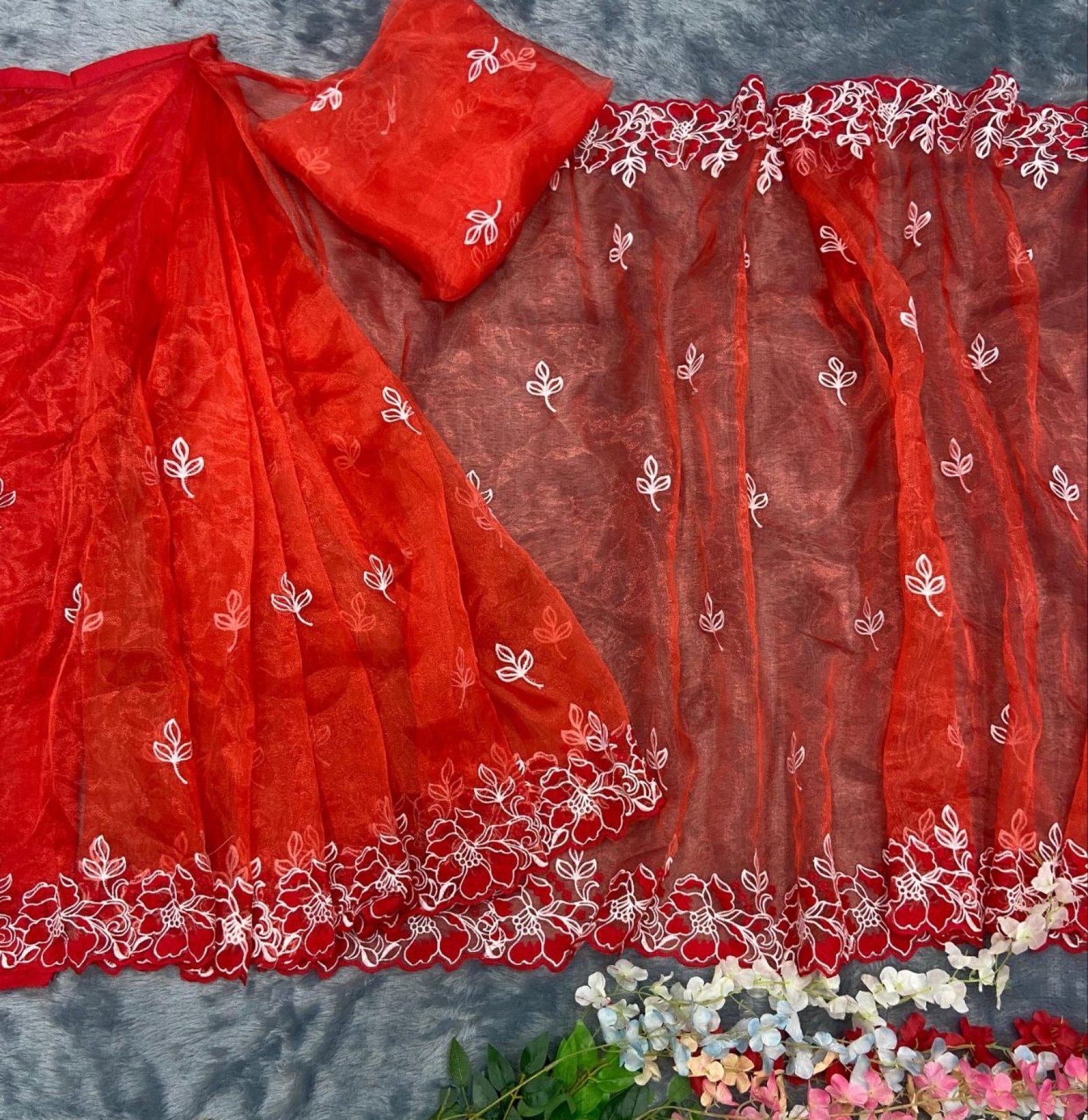 Saree : Premium Organza Silk Embellished With Beautiful Thread Embroidery Work With Cutwork Border( Ready To Wear )