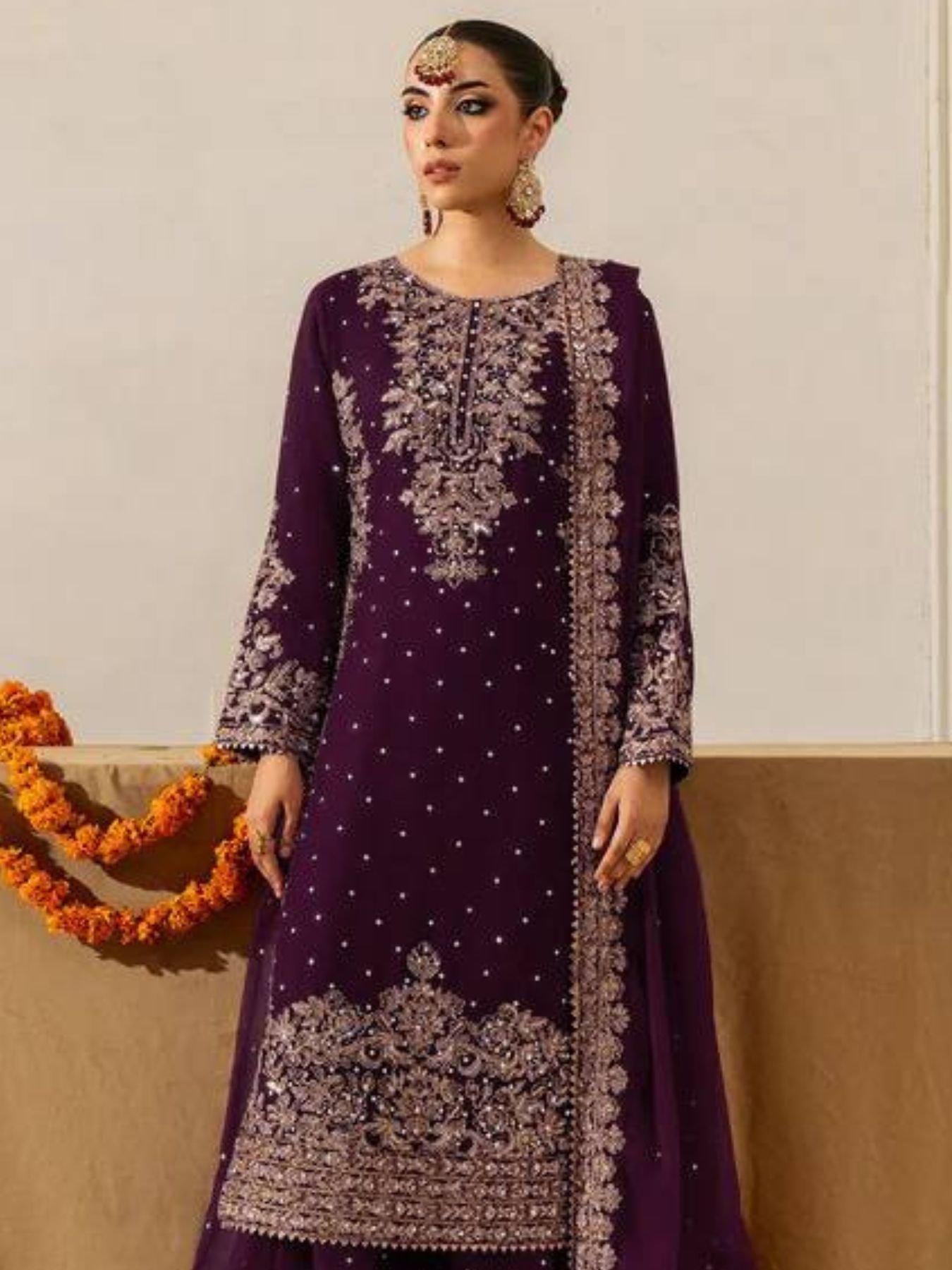 Make a statement at weddings and parties with this designer faux georgette set featuring heavy coding and sequence embroidery with rivet moti.Flared plazzo with elastic waist and matching dupatta with four-side lace border enhances your festive look.Fully stitched and ready to wear in sizes M to XXL, with 3XL margin for a custom fit.