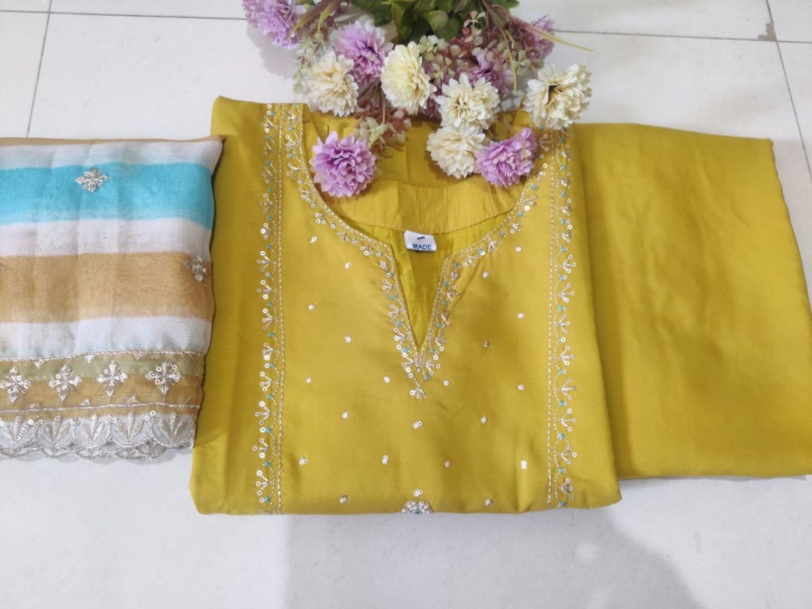 Upgrade your ethnic wardrobe with this exquisite designer Kurti set, crafted from luxurious Roman Silk for a sophisticated look. Paired with matching Roman Silk pants featuring a functional pocket, and a beautiful Taby Silk dupatta, this ensemble is designed for elegance and comfort.