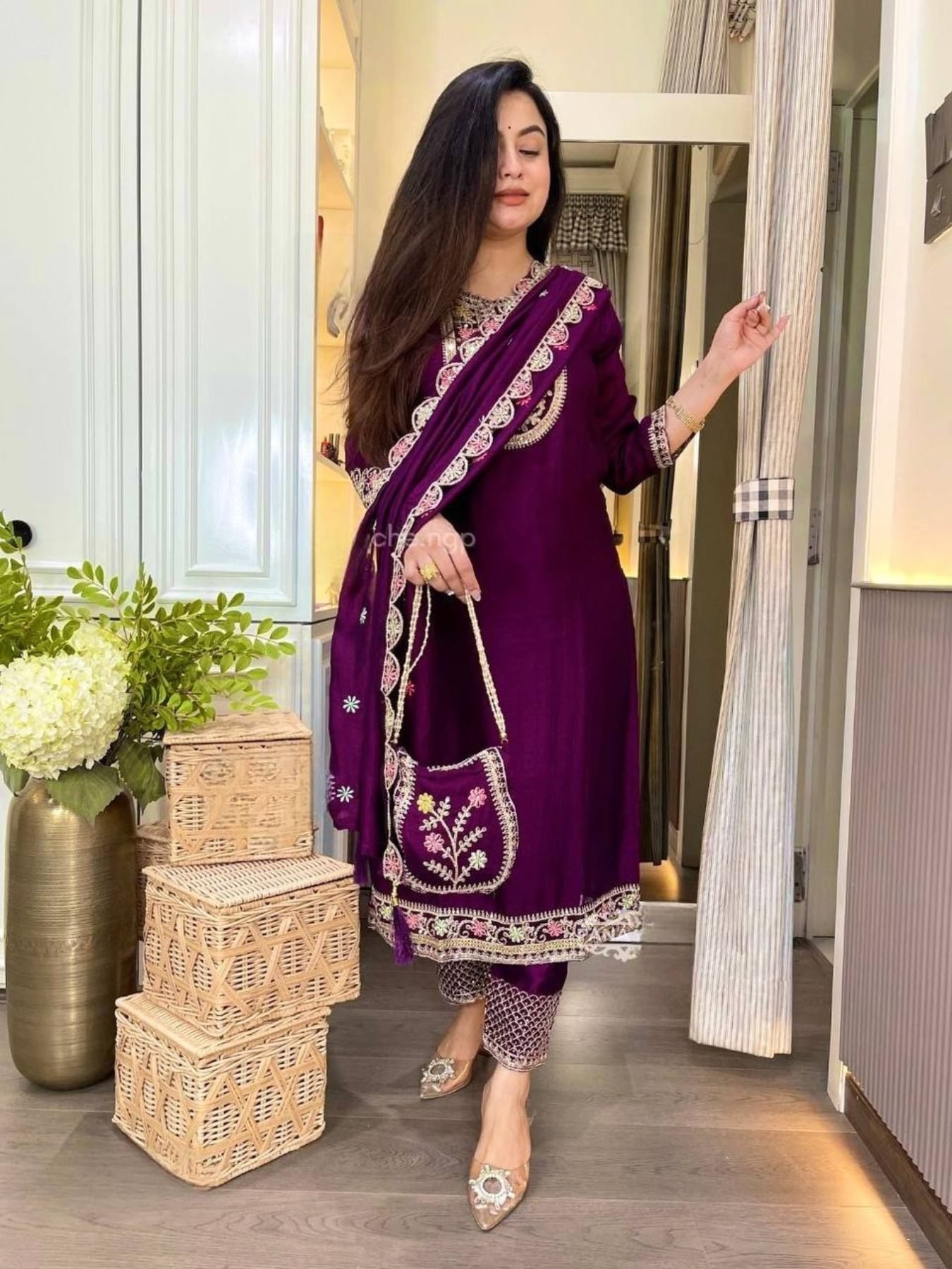 Royal Muse Deep Purple Chinon Silk Suit with Embroidery & Designer Dupatta